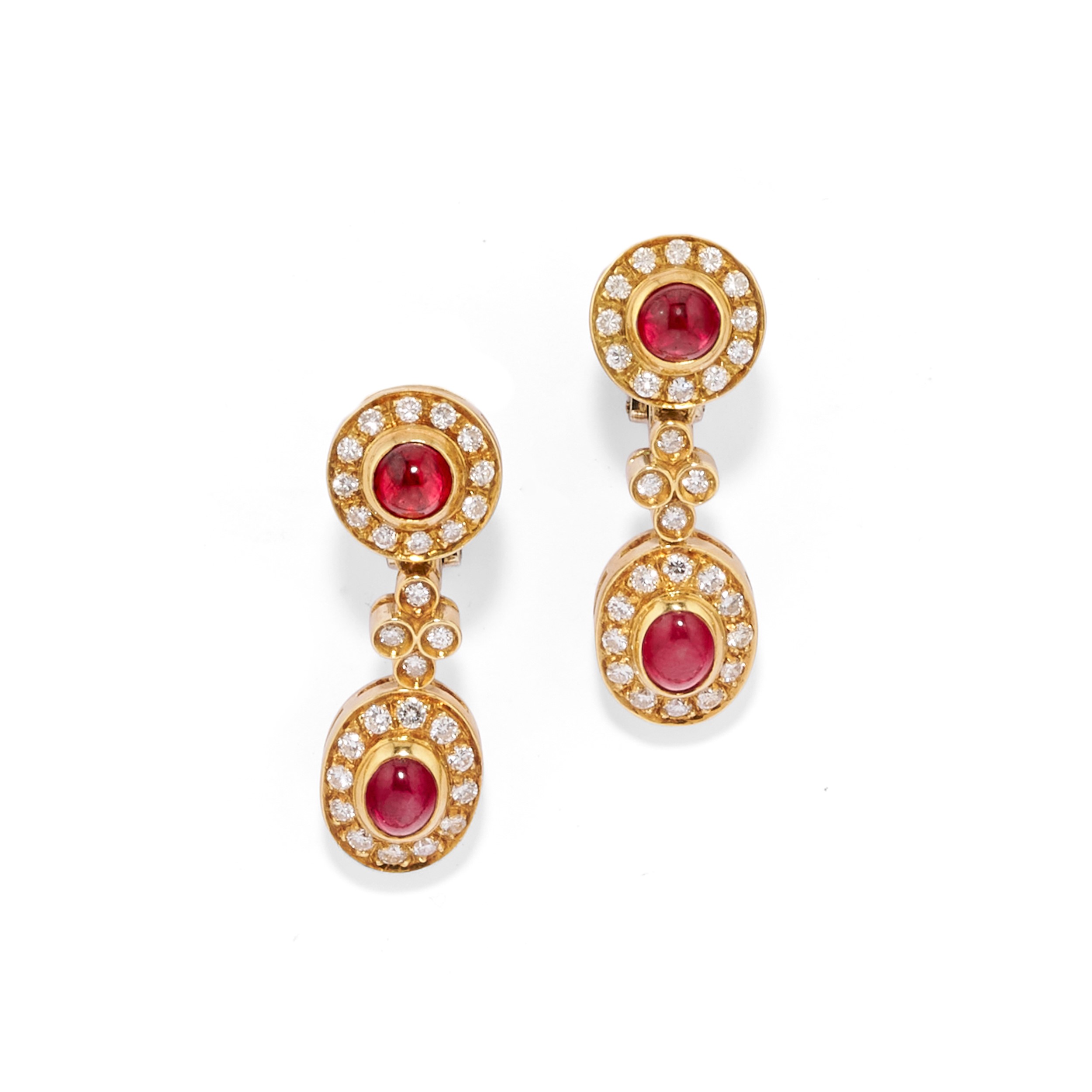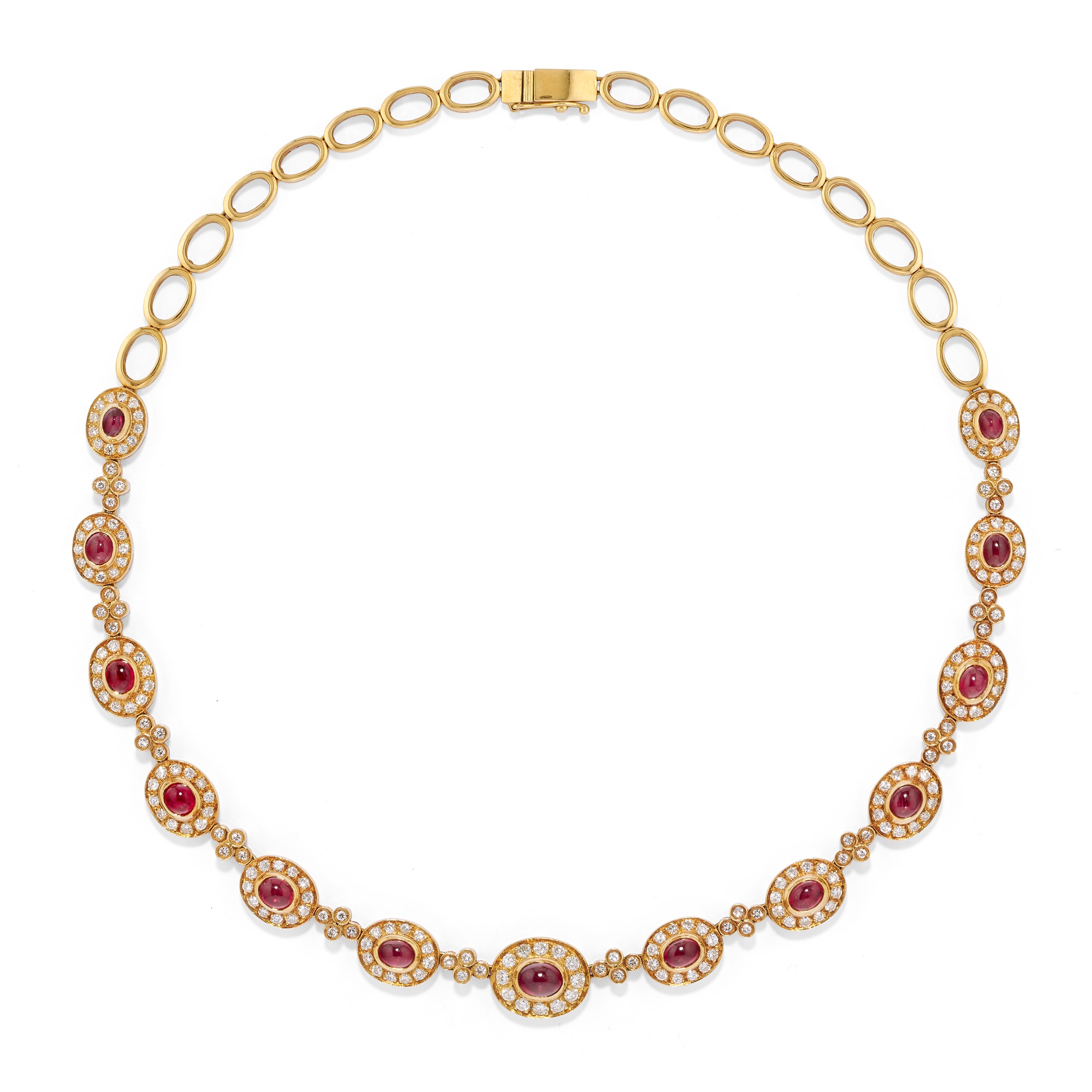 composta da collana e orecchini pendenti con chiusura a perno e clip, a moduli ovali con al centro rubini taglio ovale cabochon per totale ct 10,00 circa e diamanti taglio brillante per totale ct 6,00 circa a decoro.