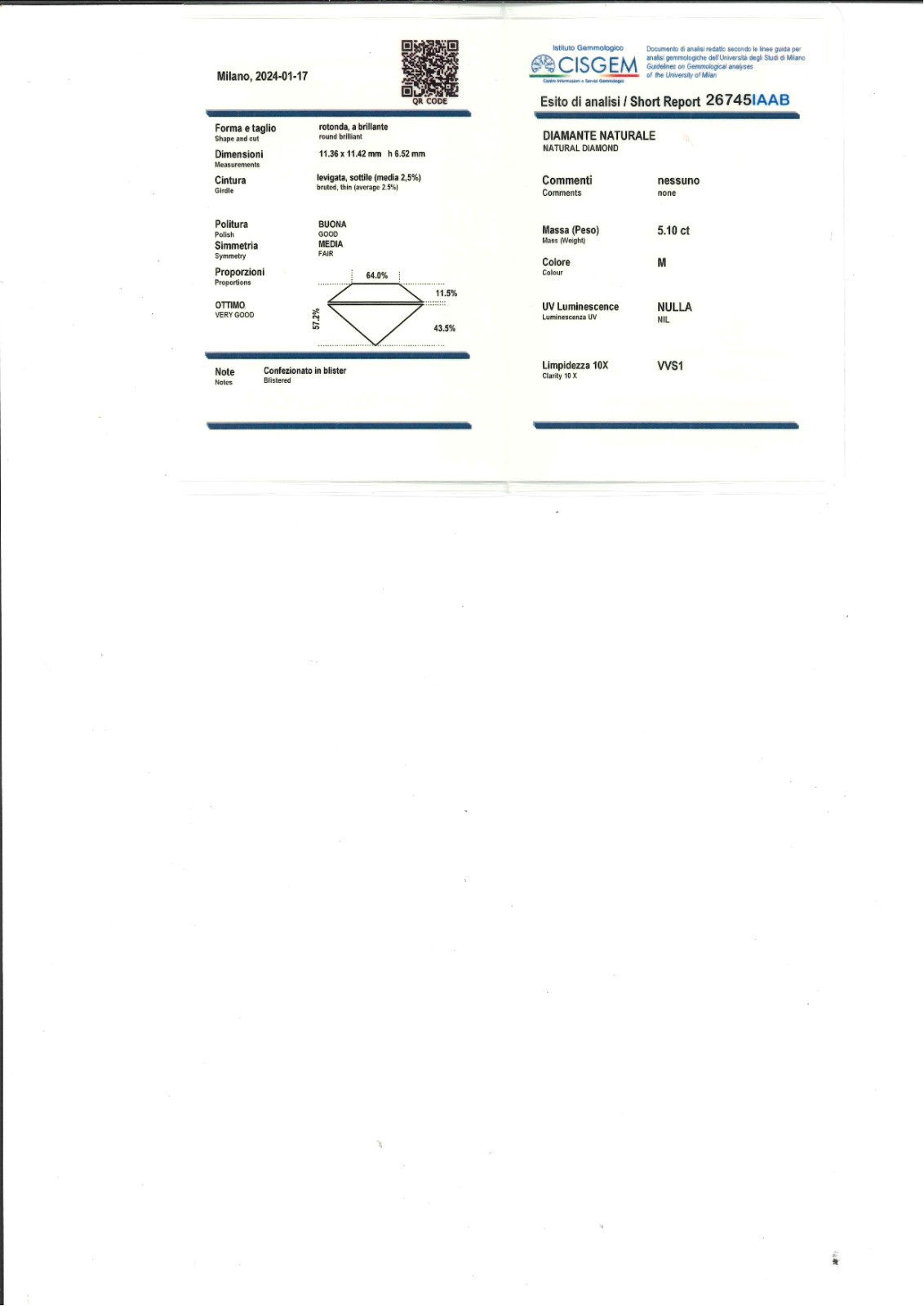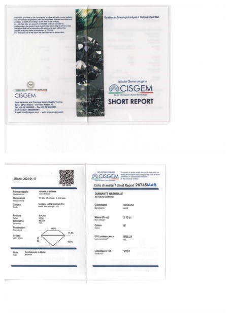 Il diamante è accompagnato da short report n. 26745IAAB del 17/01/2024 CISGEM, Milano.