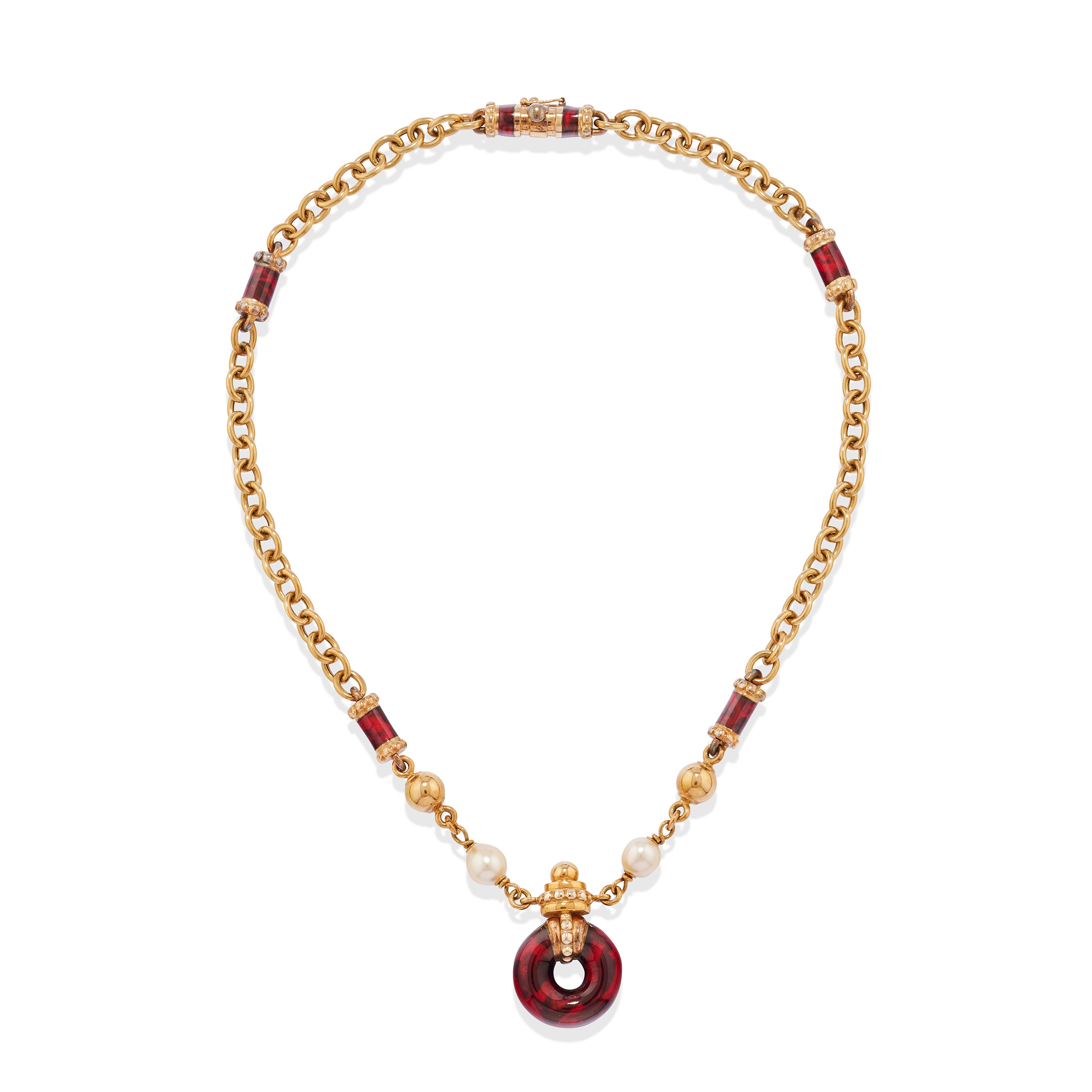 in oro giallo 18k e argentocomposta da collana, bracciale rigido e orecchini pendenti con chiusura a perno e farfalla con inserti in smalto e perle coltivate.