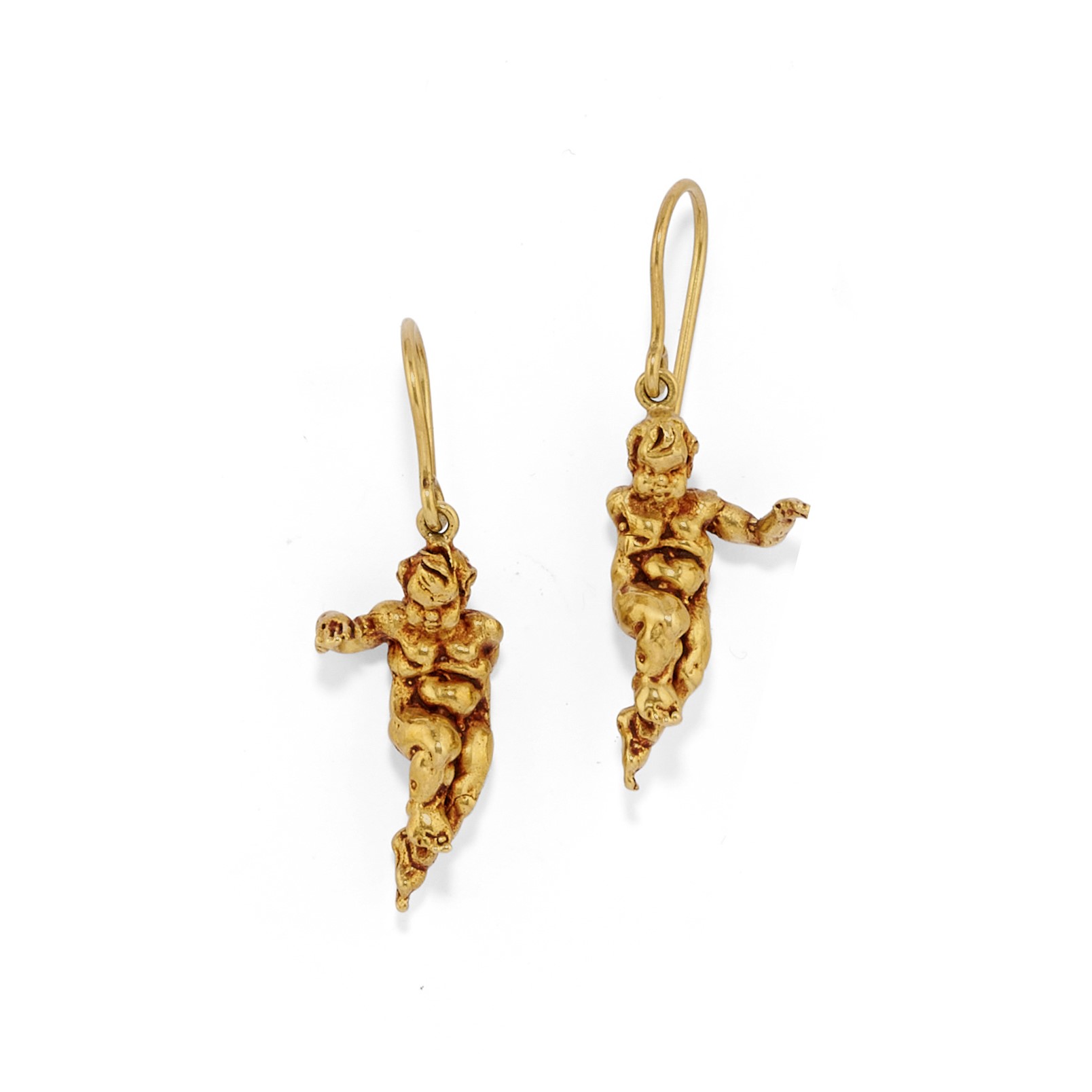in oro giallo 18kcomposta da anello a fascia con putti danzanti e coppia di orecchini con putti e chiusura a monachella aperta.