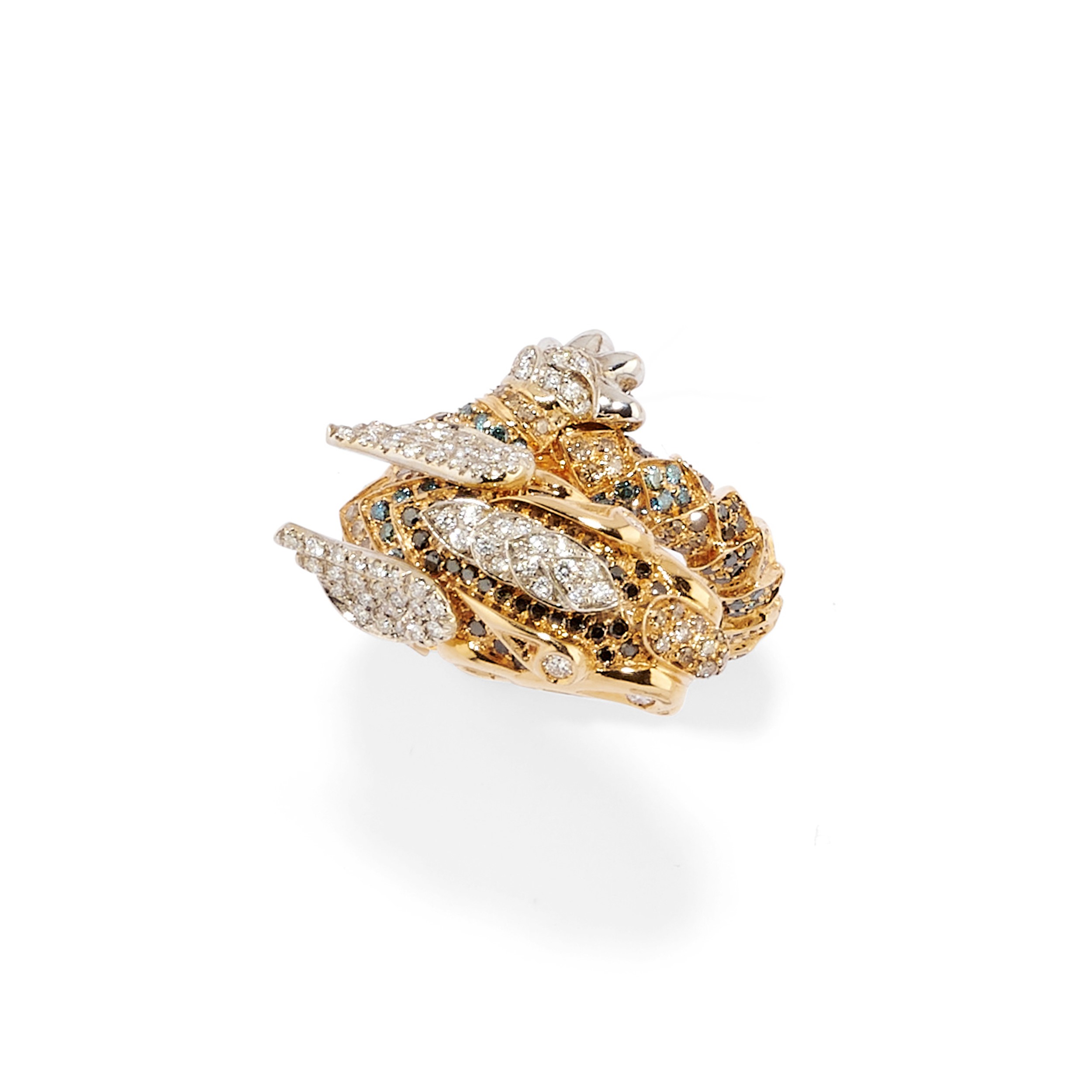 in oro rosso e bianco 18kin diamanti incolori, colorati e rubini taglio rotondo.