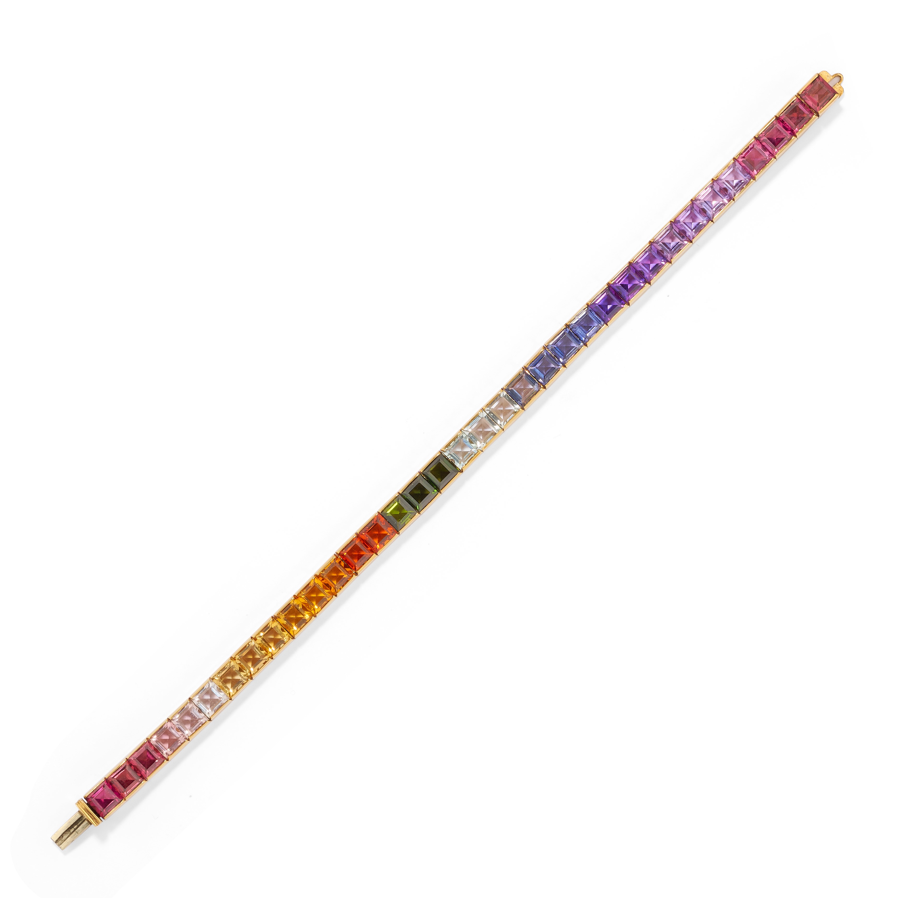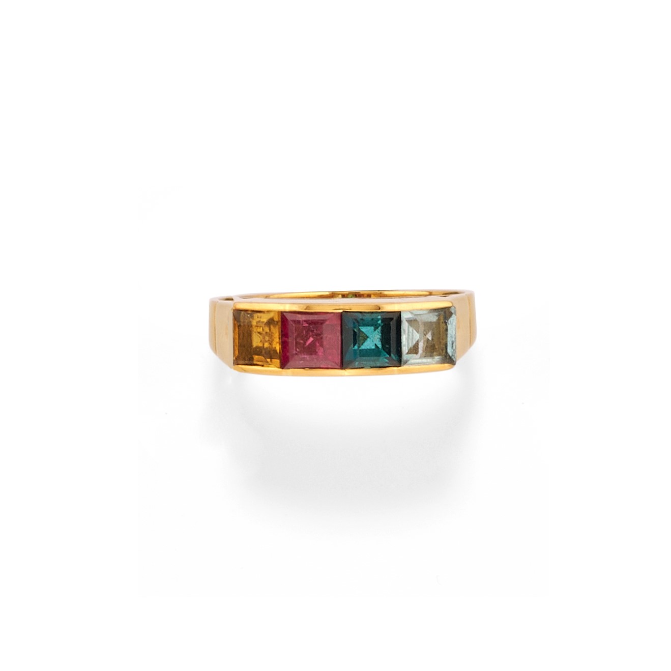 composta da collana semirigida, bracciale e anello con pietre semi-preziose (tormaline, quarzi, topazi, granati, ametiste) taglio carrè.