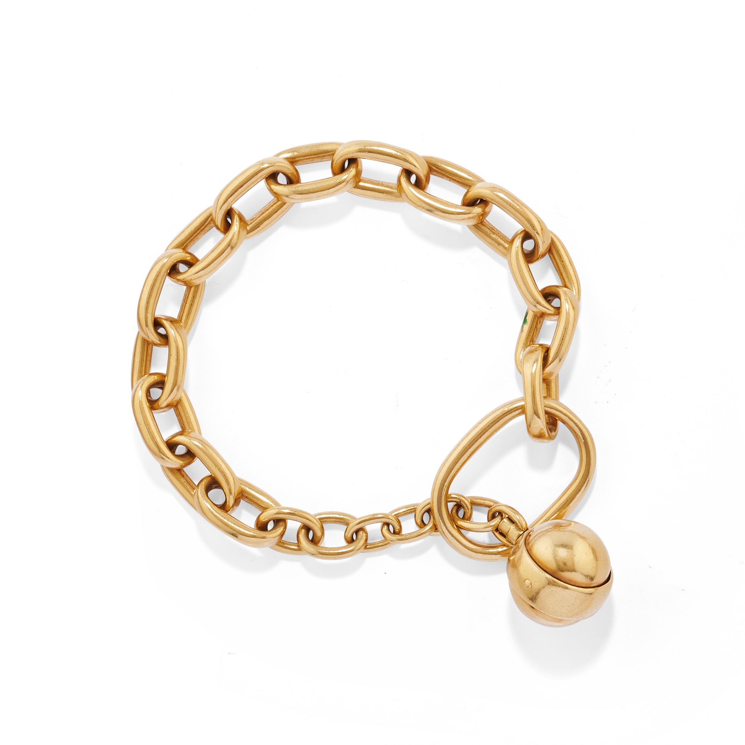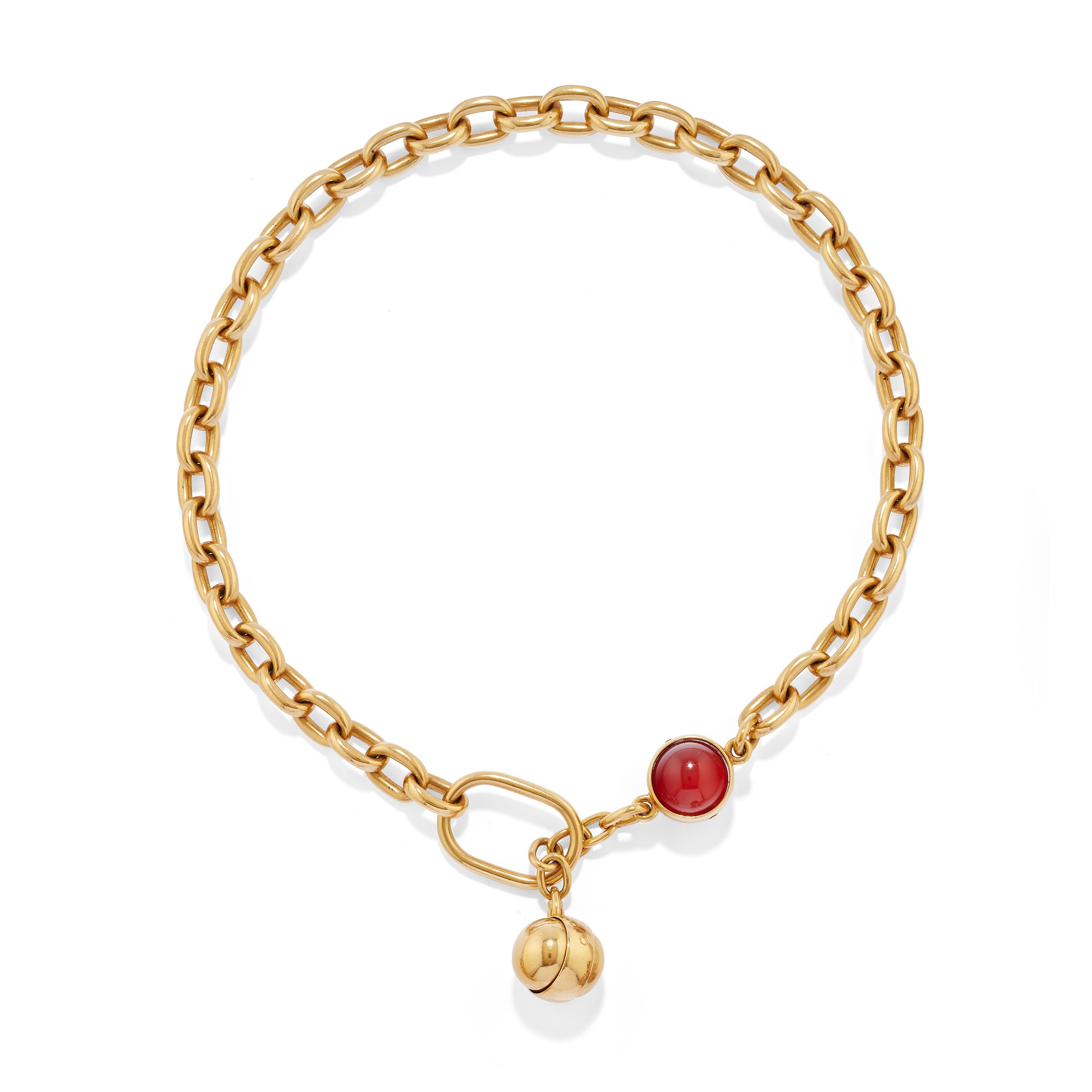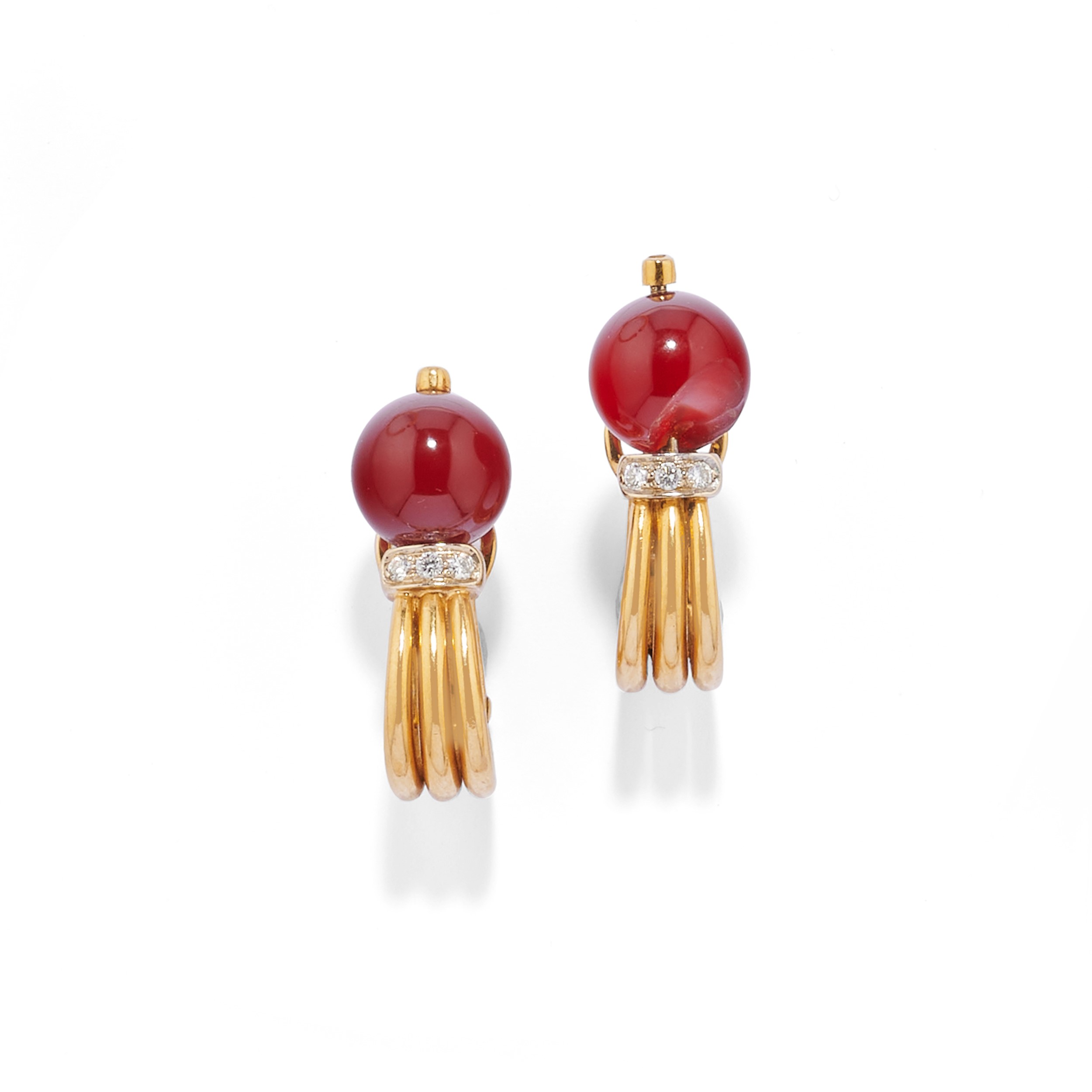 in oro giallo 18kcomposta da collana e bracciale realizzati con maglie ovali, con boules in corniola e diamanti taglio brillante, chiusura a pressione, e orecchini con chiusura a perno e clip, difetti (un perno mancante e una boule con mancanze).
