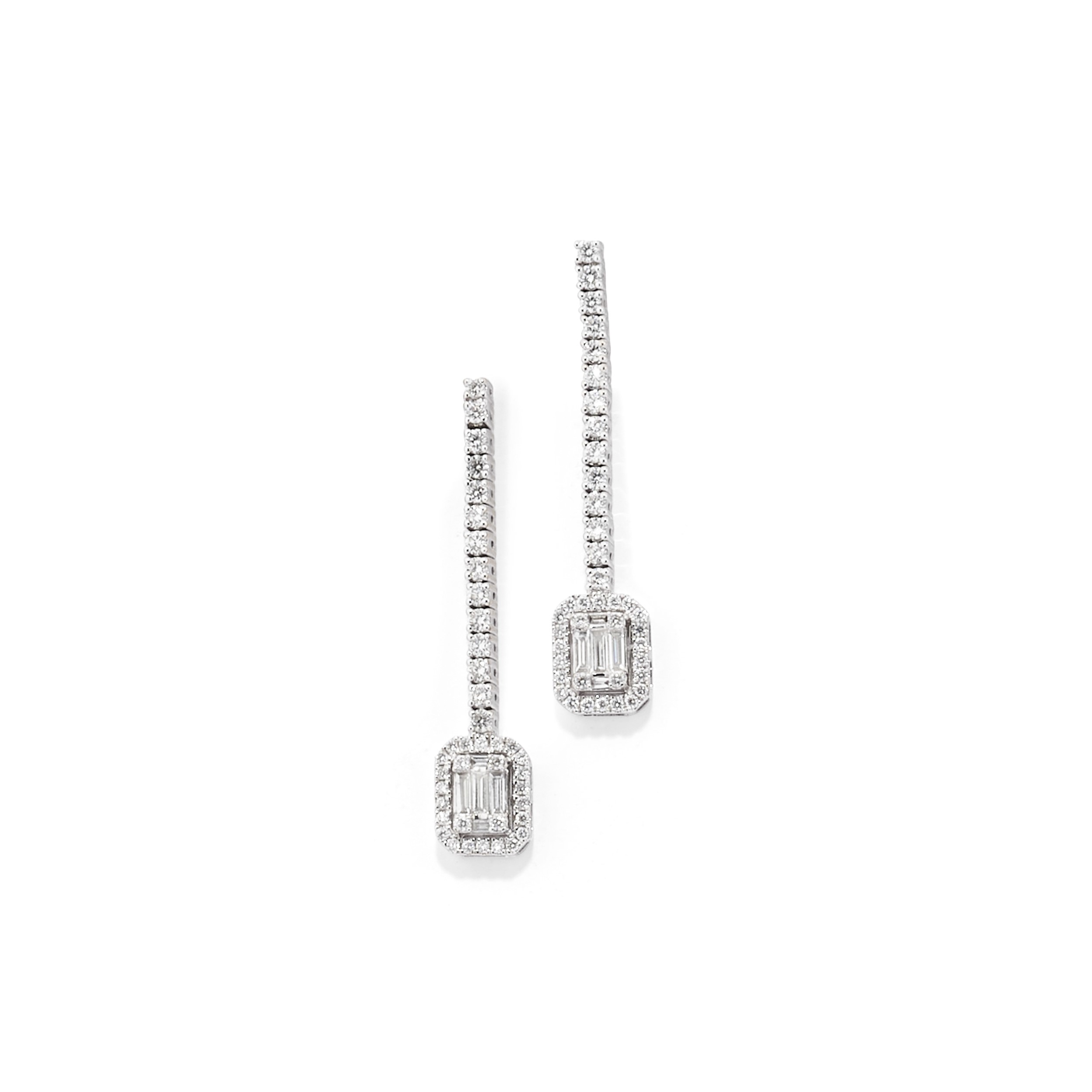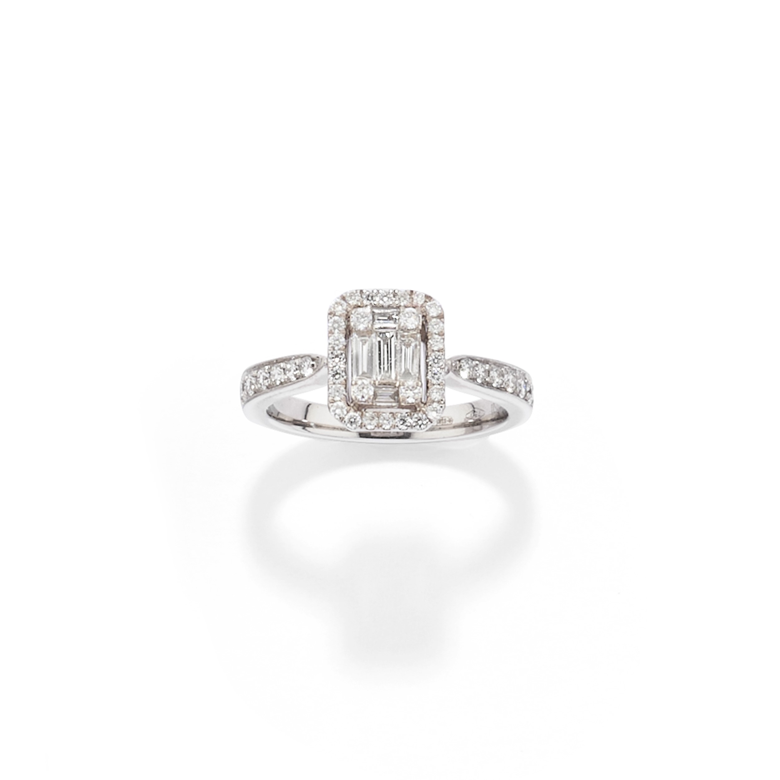 in oro bianco 18kcomposta da anello e orecchini pendenti, con diamanti taglio baguette per totale ct 0,50 circa e diamanti taglio brillante a decoro, chiusura perno e farfalla, con scatola.
