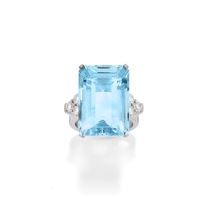 con acquamarina taglio rettangolare taglio a gradini di ct 20,50 circa, ai lati motivi in diamanti taglio brillante per totale ct 0,60 circa.