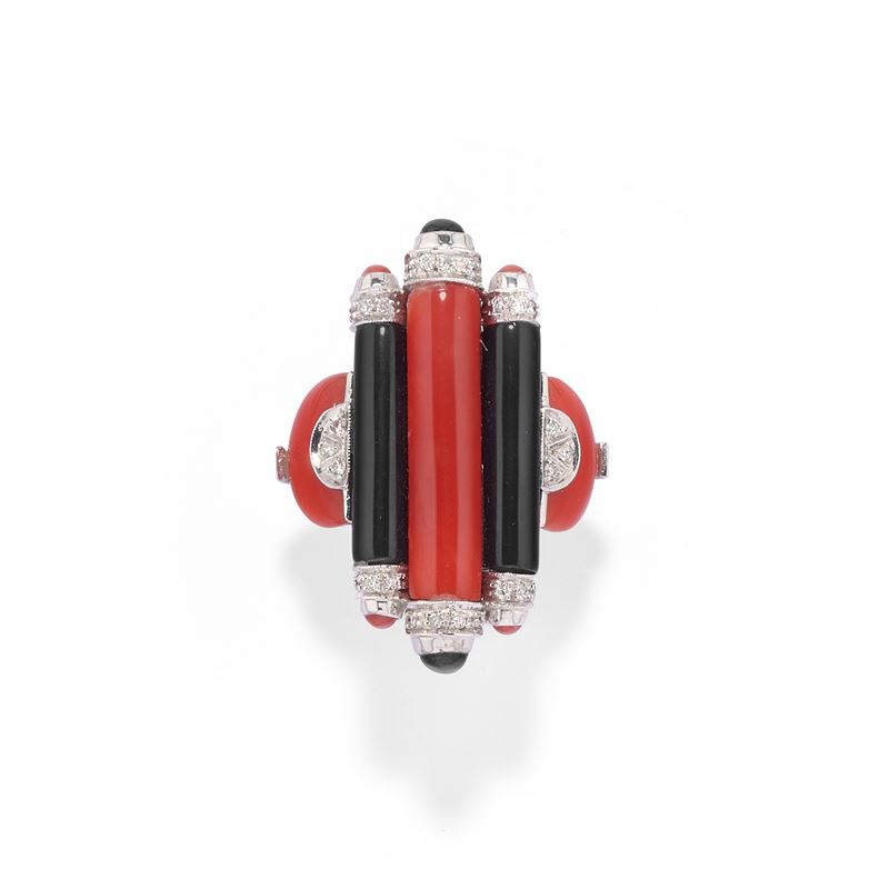 in oro bianco 18kin stile decò, con cilindri e dischi in corallo e onice e decorato in motivi in diamanti taglio brillante.
