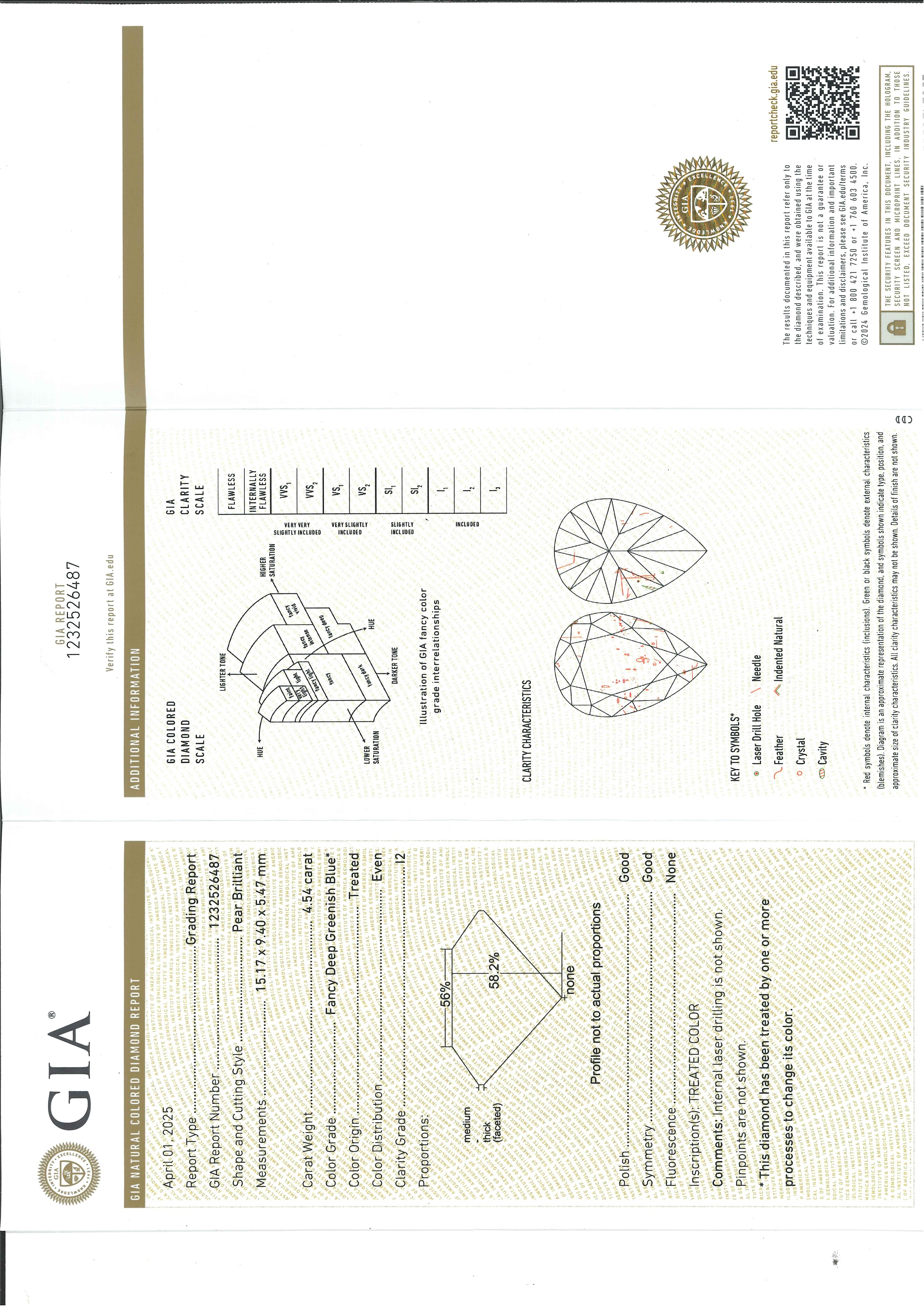 in platinoal centro diamante treated, fancy deep greenish blue, even, I2 di forma a goccia, taglio sfaccettato di ct 4,54, ai lati due diamanti taglio goccia per totale ct 1,00 circa (prob. colore G-H purezza SI), con molla interna.