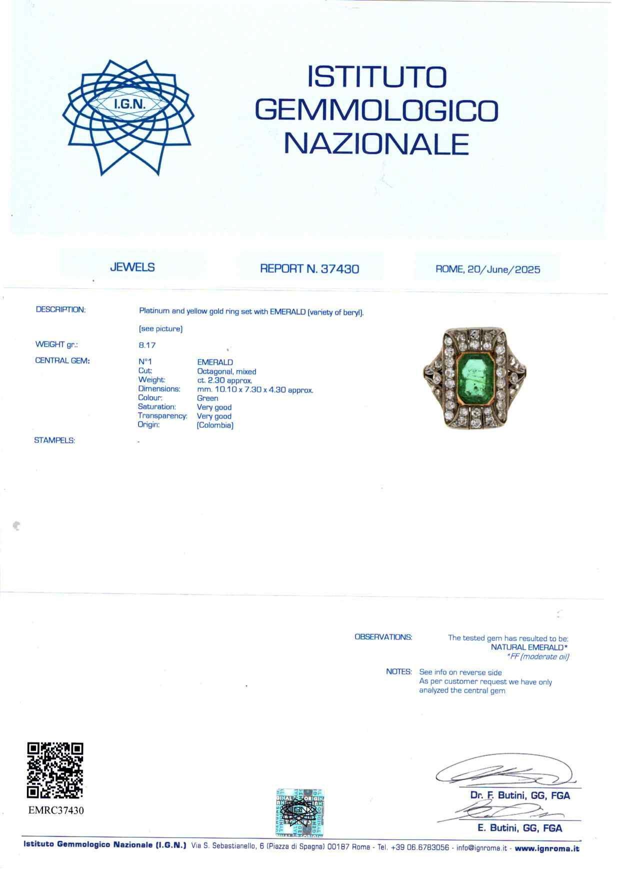in platino e oro giallo 18Kal centro smeraldo Colombia taglio ottagonale di ct 2,30 circa, contorno in diamanti taglio huit-huit e rosa.