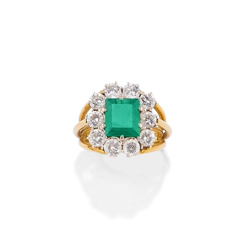 in oro giallo 18kal centro smeraldo taglio carré di ct 1,30 circa, contorno in diamanti taglio brillante per totale ct 1,50 circa.