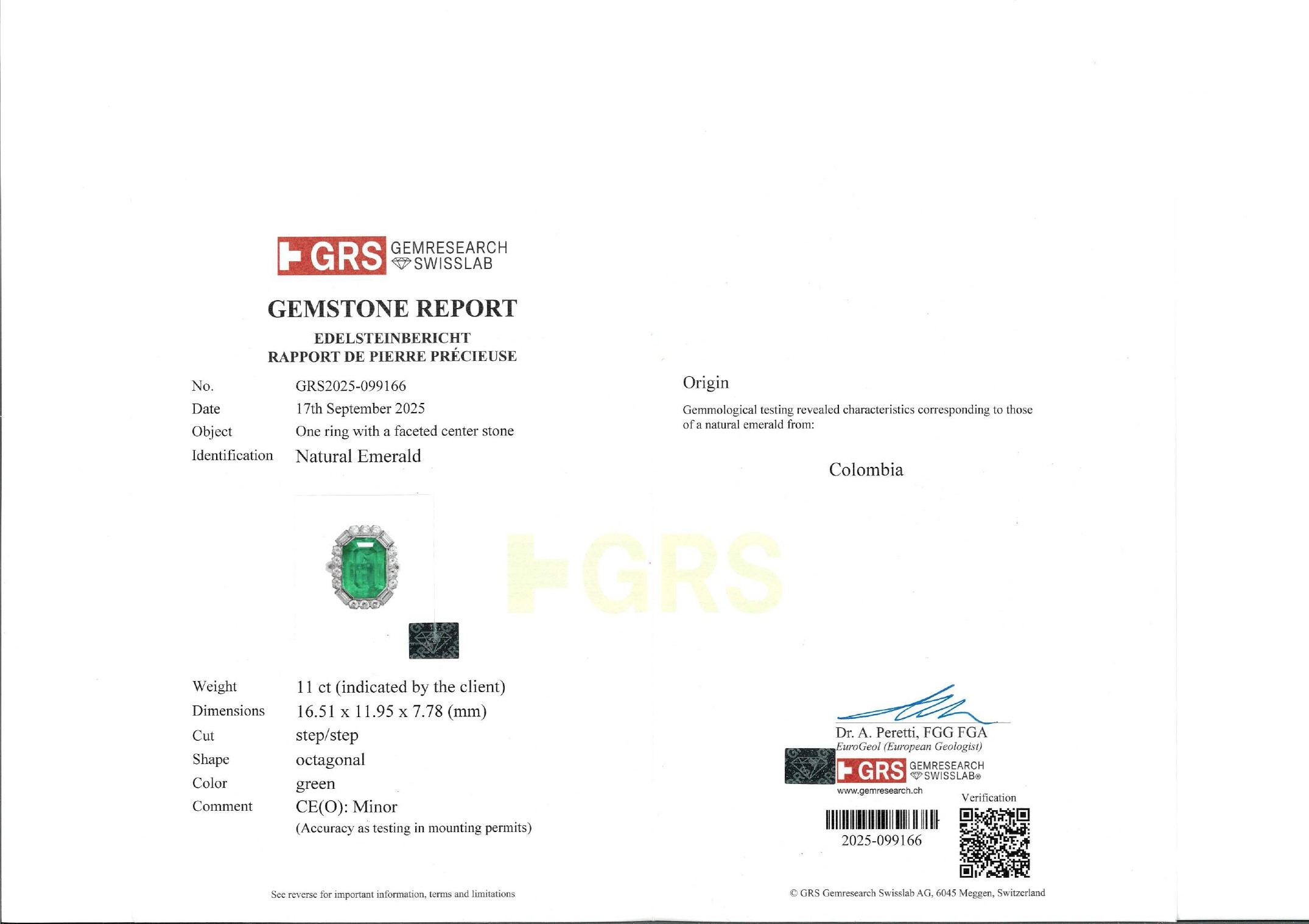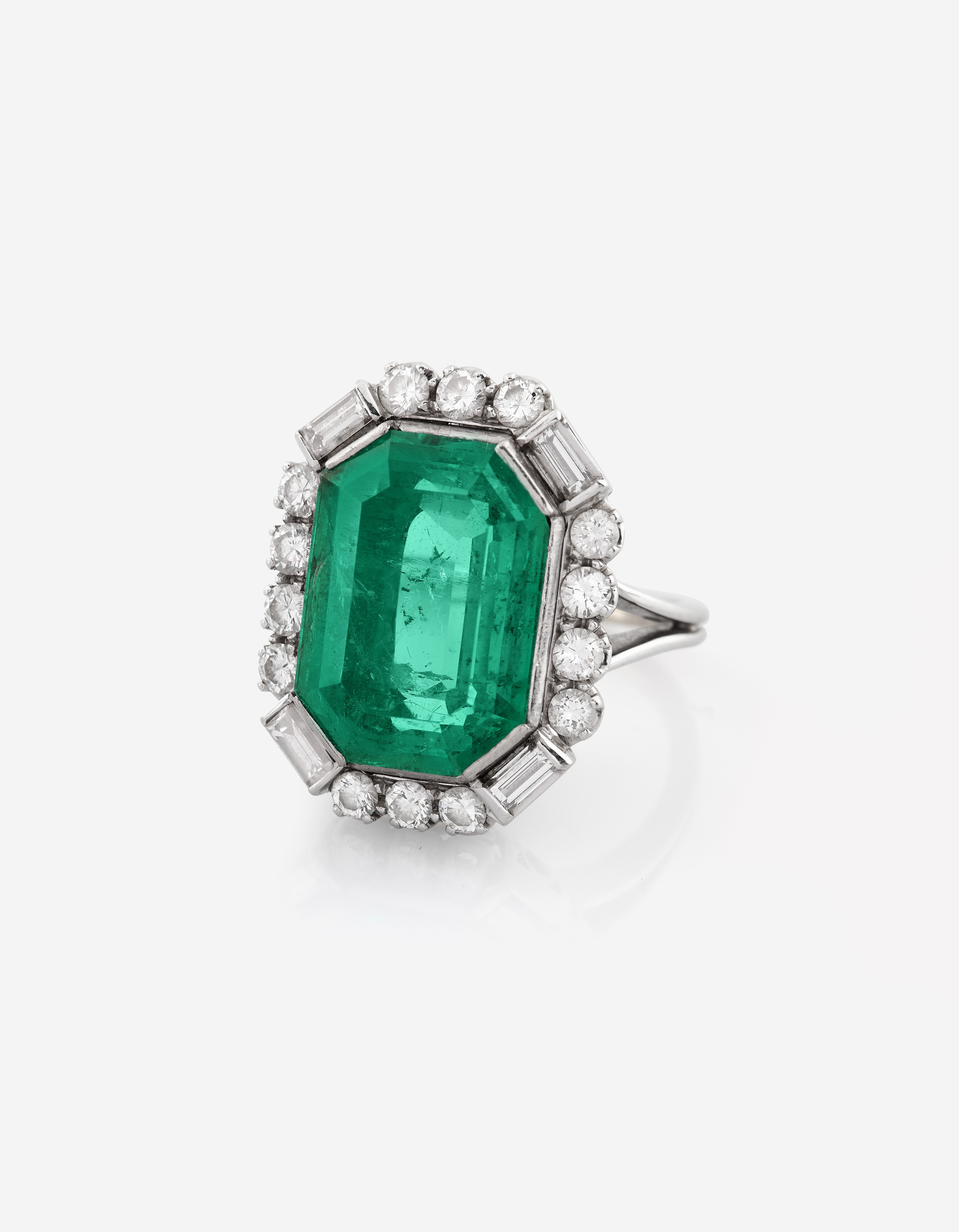 in oro bianco 18kal centro smeraldo Colombia taglio ottagonale a gradini di ct 11,00 circa, contorno in diamanti taglio brillante e baguette per totale ct 1,00 circa.