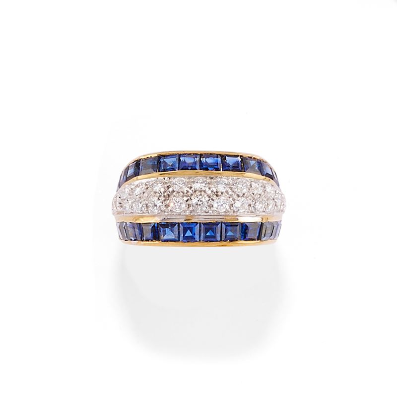 in oro giallo 18kal centro diamanti taglio brillante per totale ct 0,50 circa, al lati zaffiri taglio carré per totale ct 3,50 circa.
