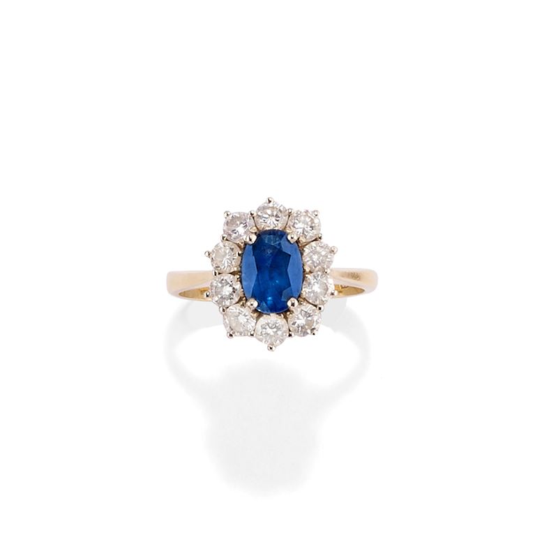 a fiore con al centro zaffiro taglio ovale di ct 1,60 circa, contorno in diamanti taglio brillante per totale ct 0,50 circa.
