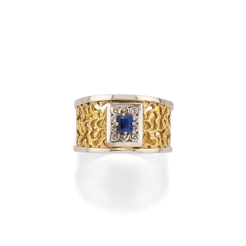 in oro bicolore 18ka fascia traforata, al centro motivo con zaffiro rettangolare e diamanti taglio huit-huit.