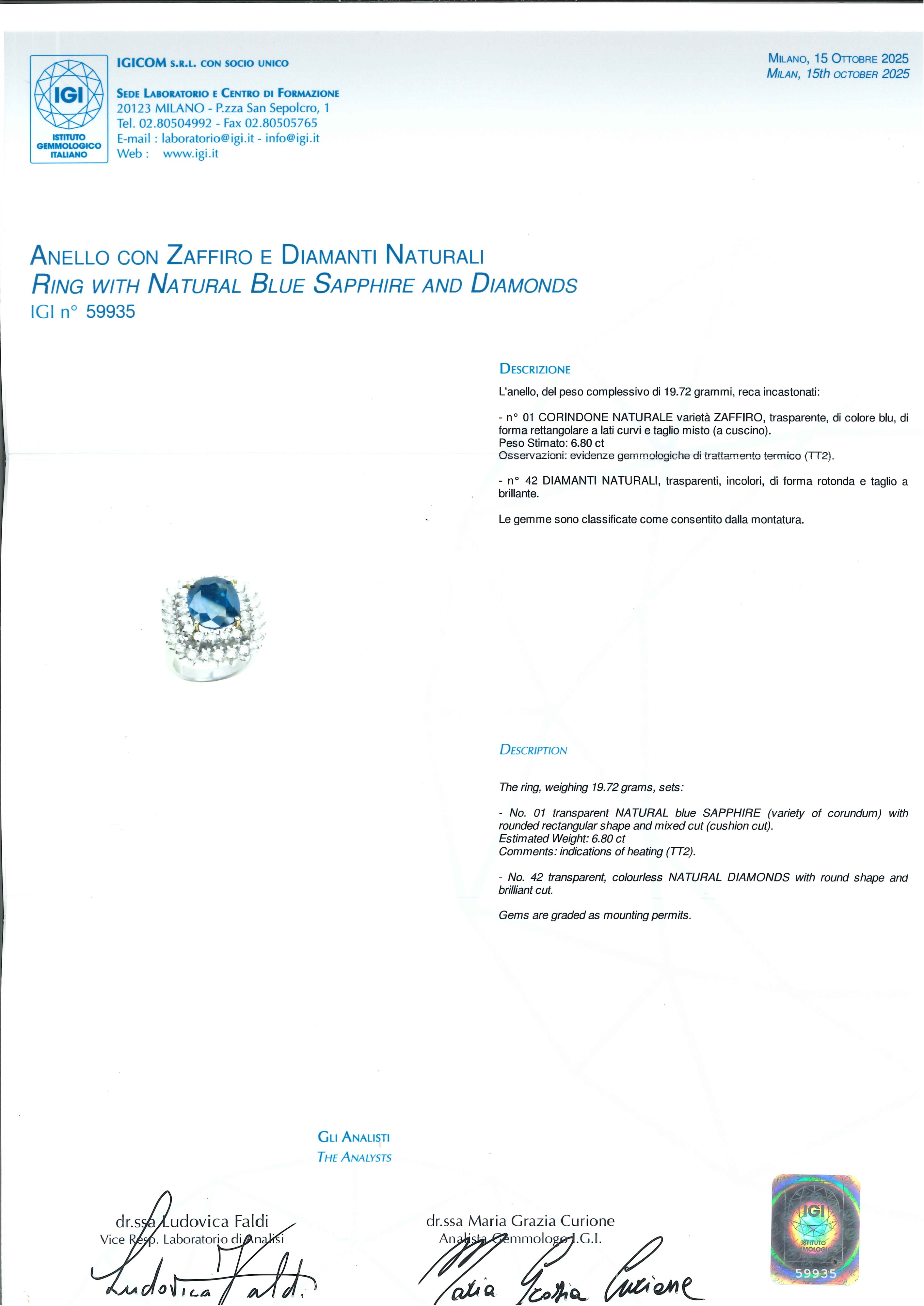 L'anello è accompagnato da certificato gemmologico n. 59935 del 15/10/2025, IGI Milano.