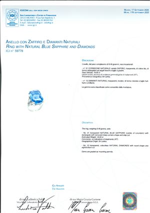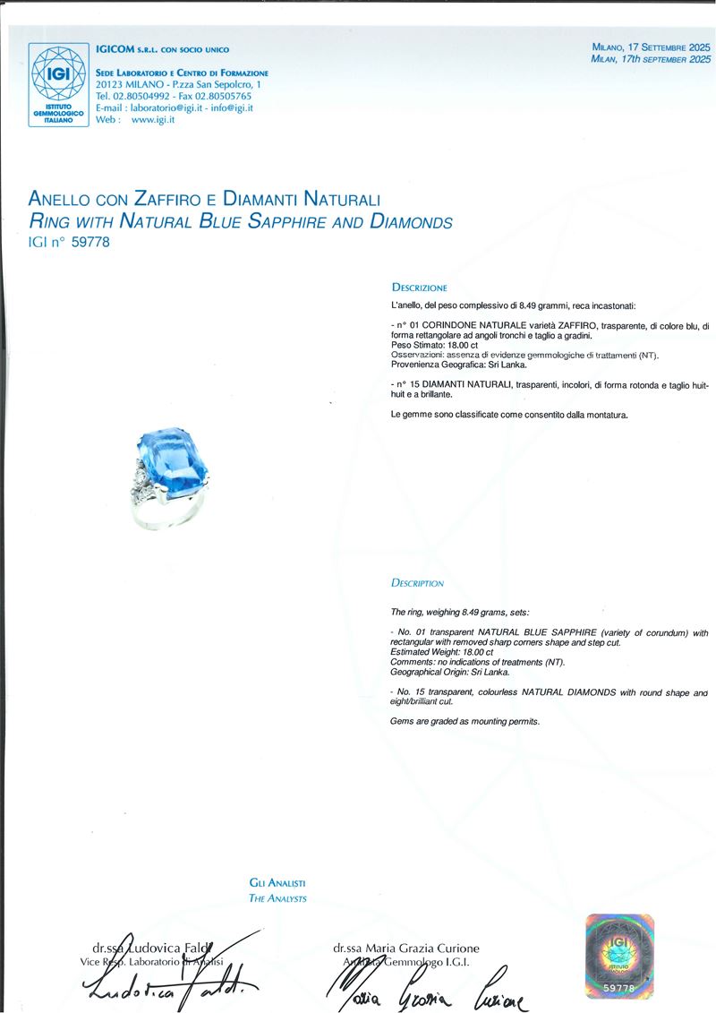 in oro bianco 18kcon zaffiro Ceylon no heat di forma ottagonale taglio a gradini di ct 18,00 circa e diamanti taglio brillante e huit-huit, difetti (tre diamanti taglio huit-huit mancanti).