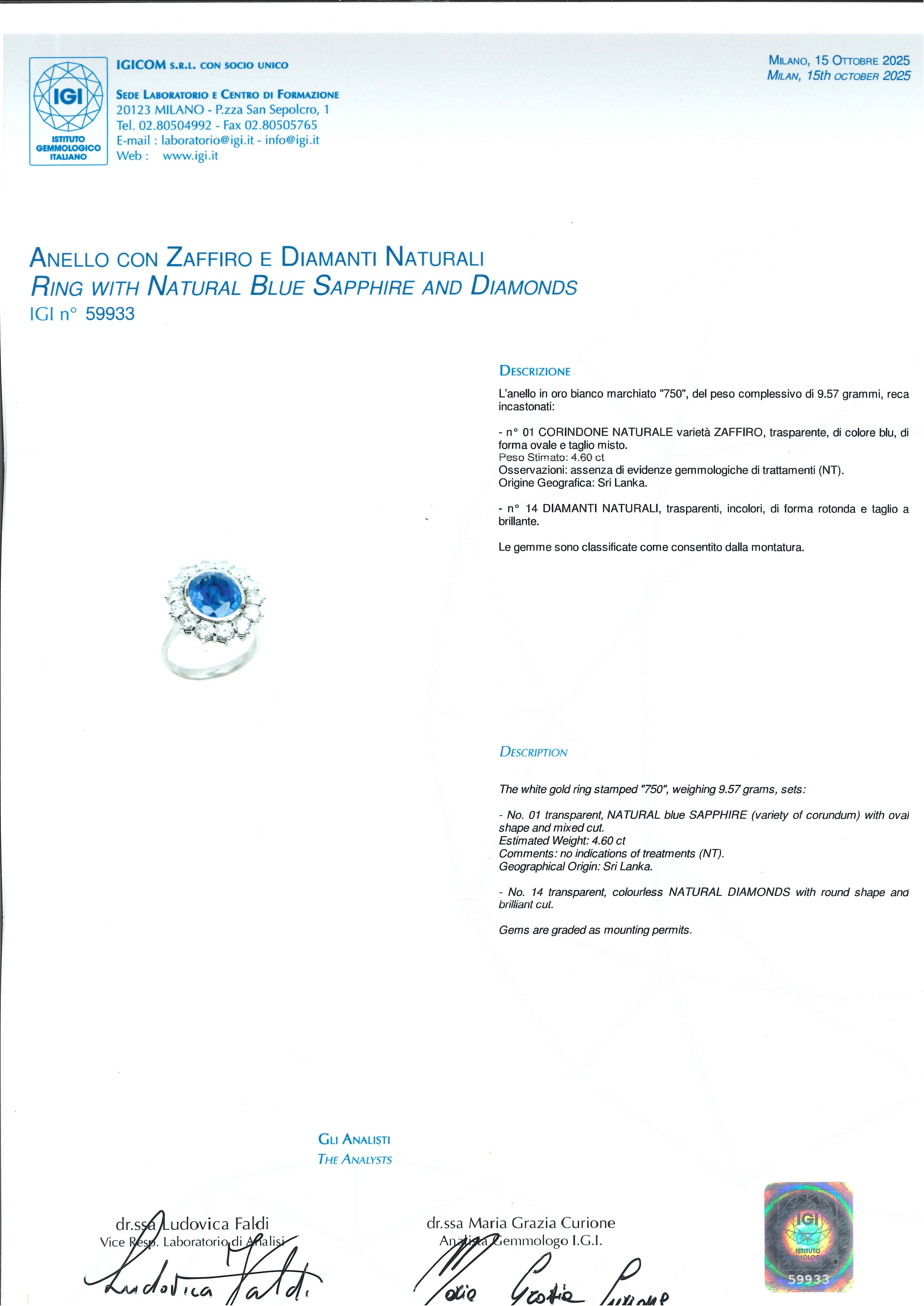 L'anello è accompagnato da certificato gemmologico n. 59933 del 15/10/2025 IGI, Milano.