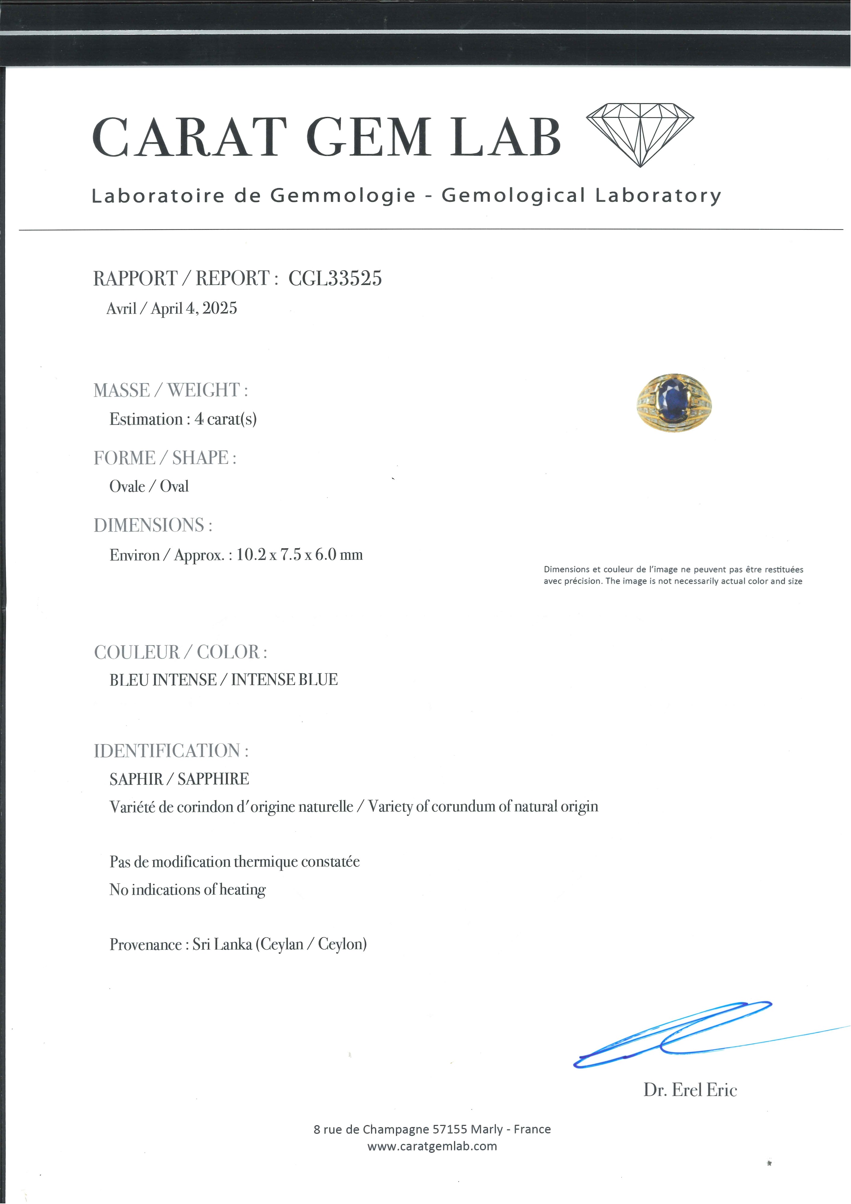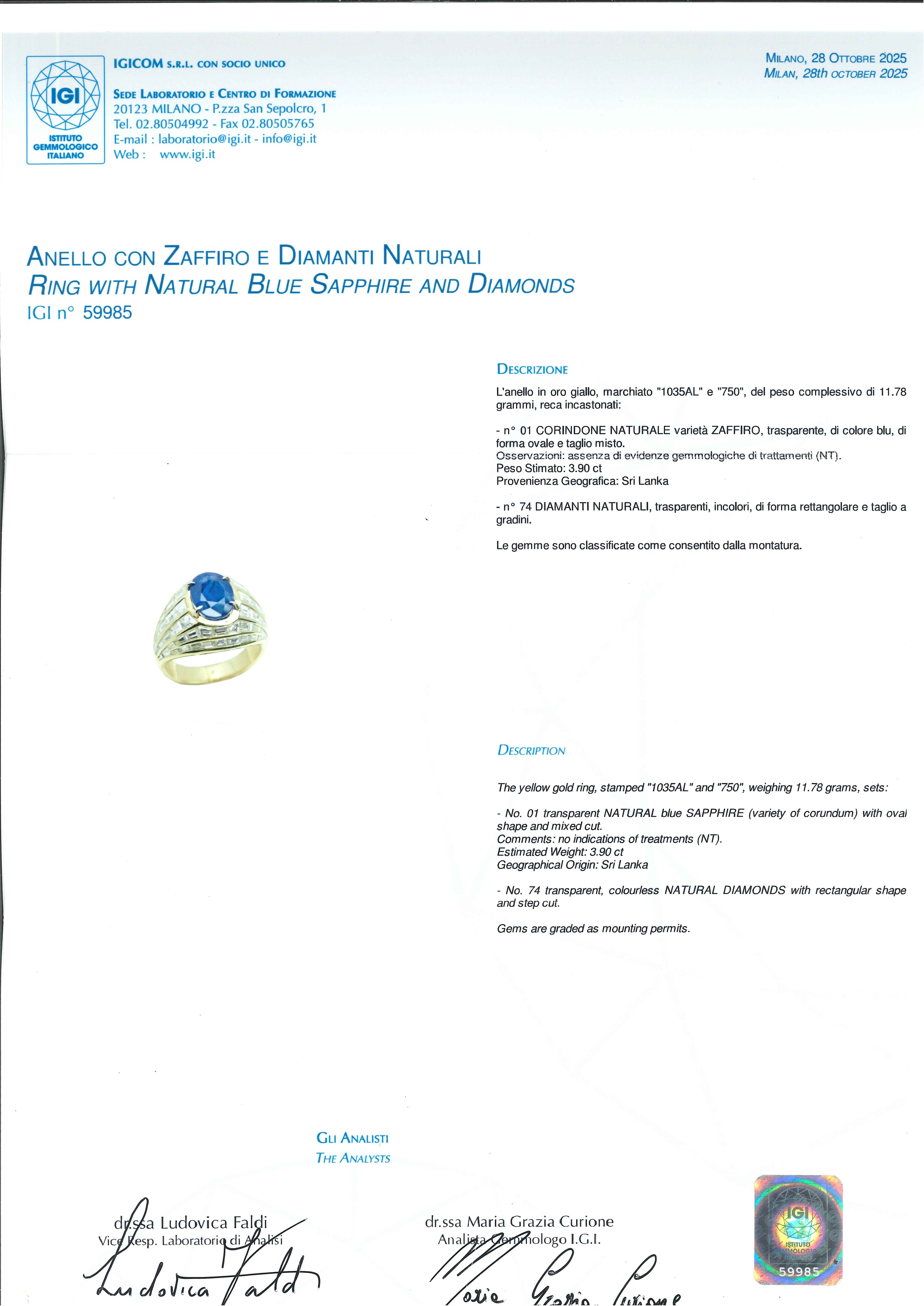 L'anello è accompagnato da certificati gemmologici Carat Gem Lab n. CGL33525 del 4 Aprile 2025, e IGI Milano n. 59985 del 18 Ottobre 2025.