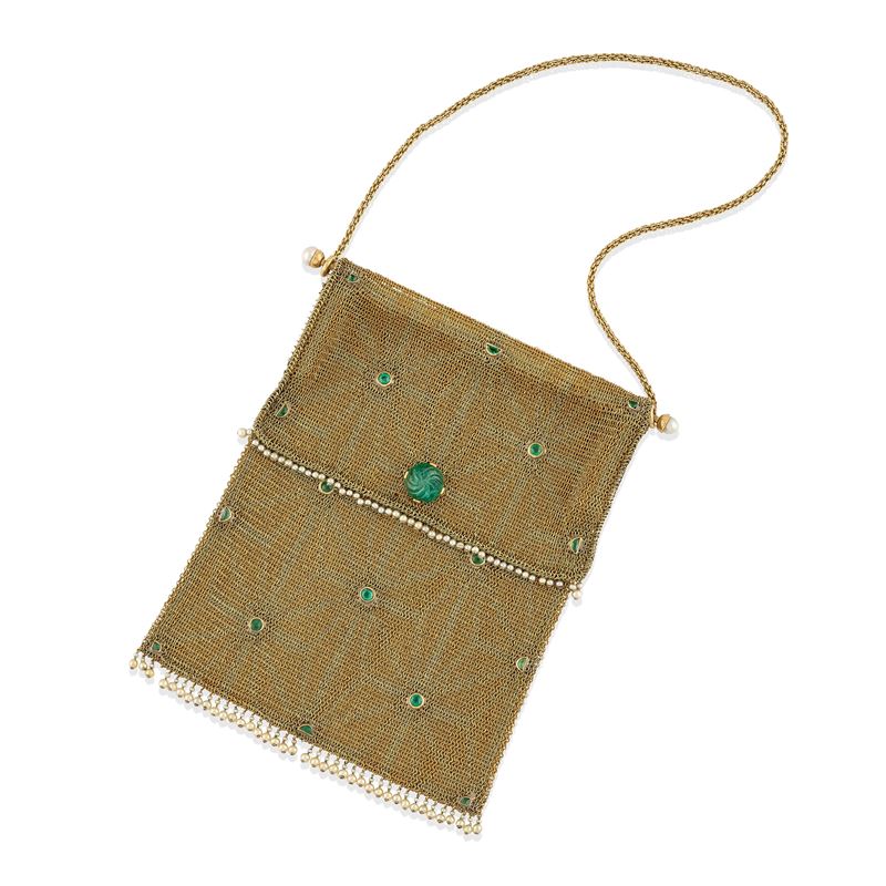in oro giallo e rosso 18krealizzata con maglia in tessuto morbido, impreziosita da smeraldi taglio rotondo e cabochon inciso, patella e bordo inferiore impreziosite da piccole perle, prob. naturali, cerniera con apertura a scatto e trattenuta da catenella.