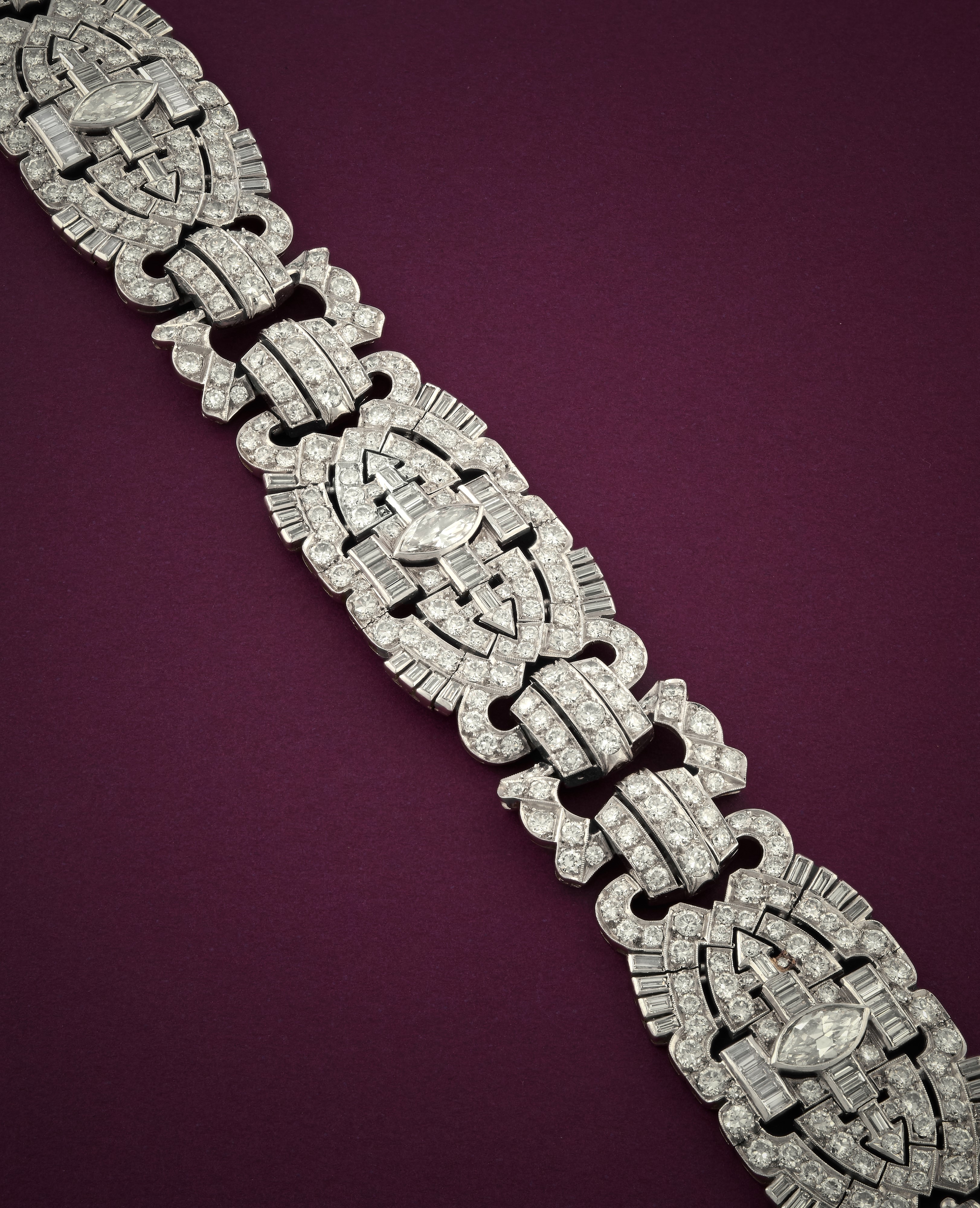 in platino e iridioa settori snodati, interamente decorato da diamanti taglio marquise, brillante e baguette per complessivi ct 12,00 circa.