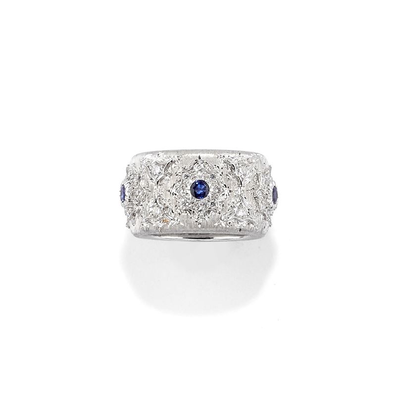 in oro bianco 18kfiori in zaffiri taglio rotondo e diamanti taglio brillante, firmato M. Buccellati, Italy, punzone 15MI.