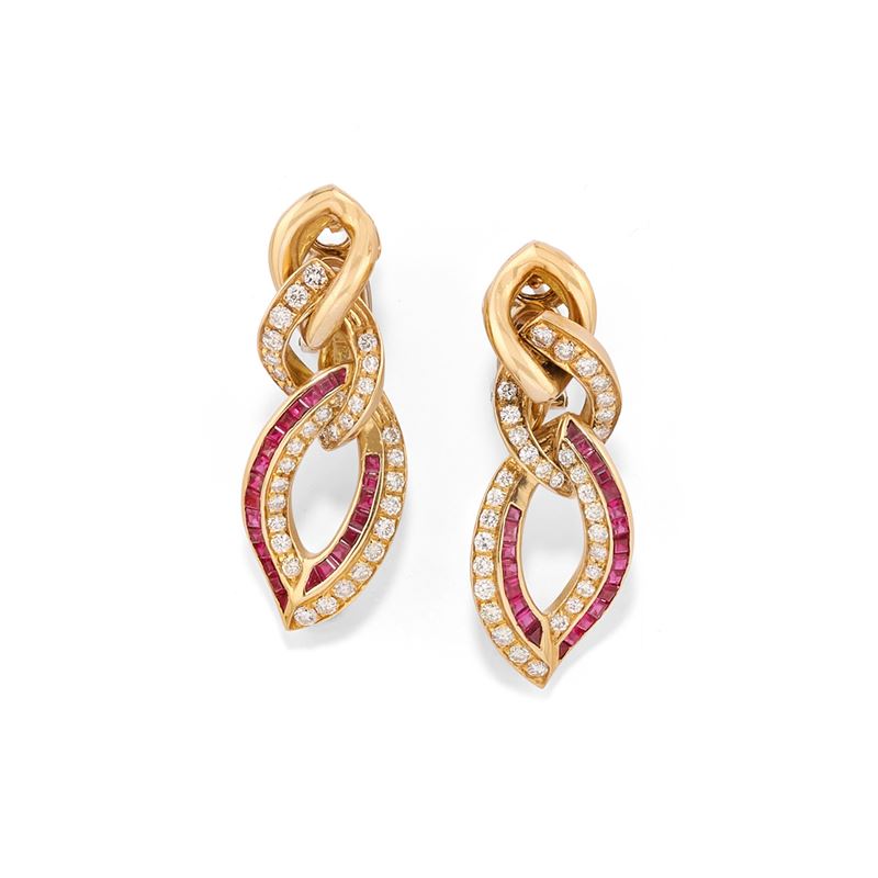 in oro giallo 18kcon maglie a catena decorate da diamanti taglio brillante e rubini taglio carré, chiusura perno e clip, firmati Bulgari.