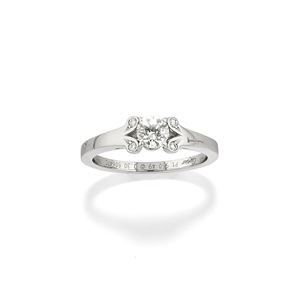 al centro diamante taglio brillante di ct 0,30 (colore E purezza VS1) e quattro diamanti taglio brillante a decoro, con scatola, dustbag, sacchetto e certificato.