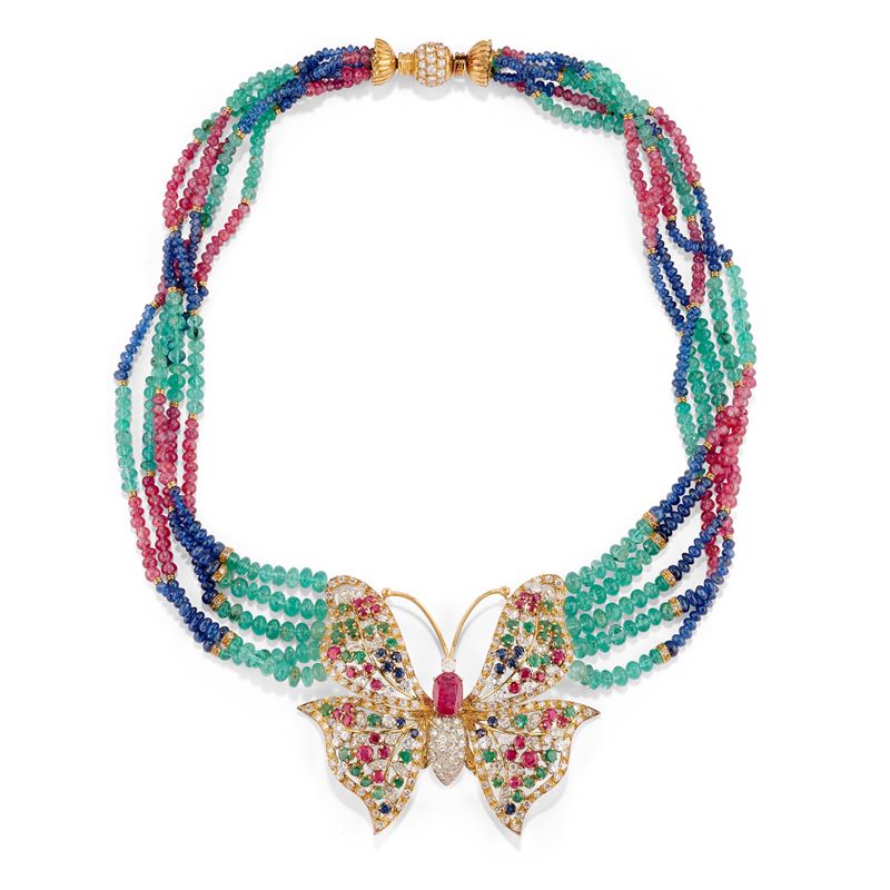 in oro giallo 18ka cinque fili di rubini, zaffiri e smeraldi intervallati a interruttori in oro e diamanti, al centro farfalla in zaffiri, rubini e smeraldi taglio rotondo, diamanti taglio brillante e huit-huit.