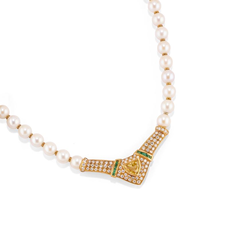 ad un filo di perle coltivate di mm 7,00/7,50 circa, centrale con zaffiro giallo taglio scudo di ct 1,00 circa, diamanti taglio brillante per totale ct 1,60 circa e smeraldi taglio carré.