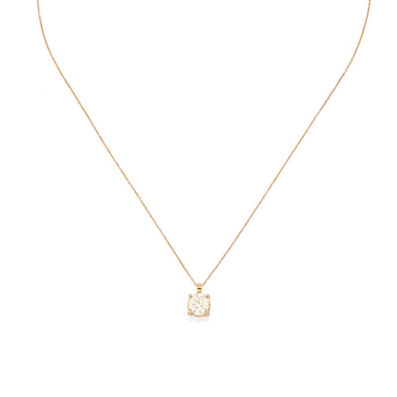 in oro giallo 18kpendente con diamante di ct 1,50 circa (prob. colore M purezza VS), trattenuto da catenina rolò.