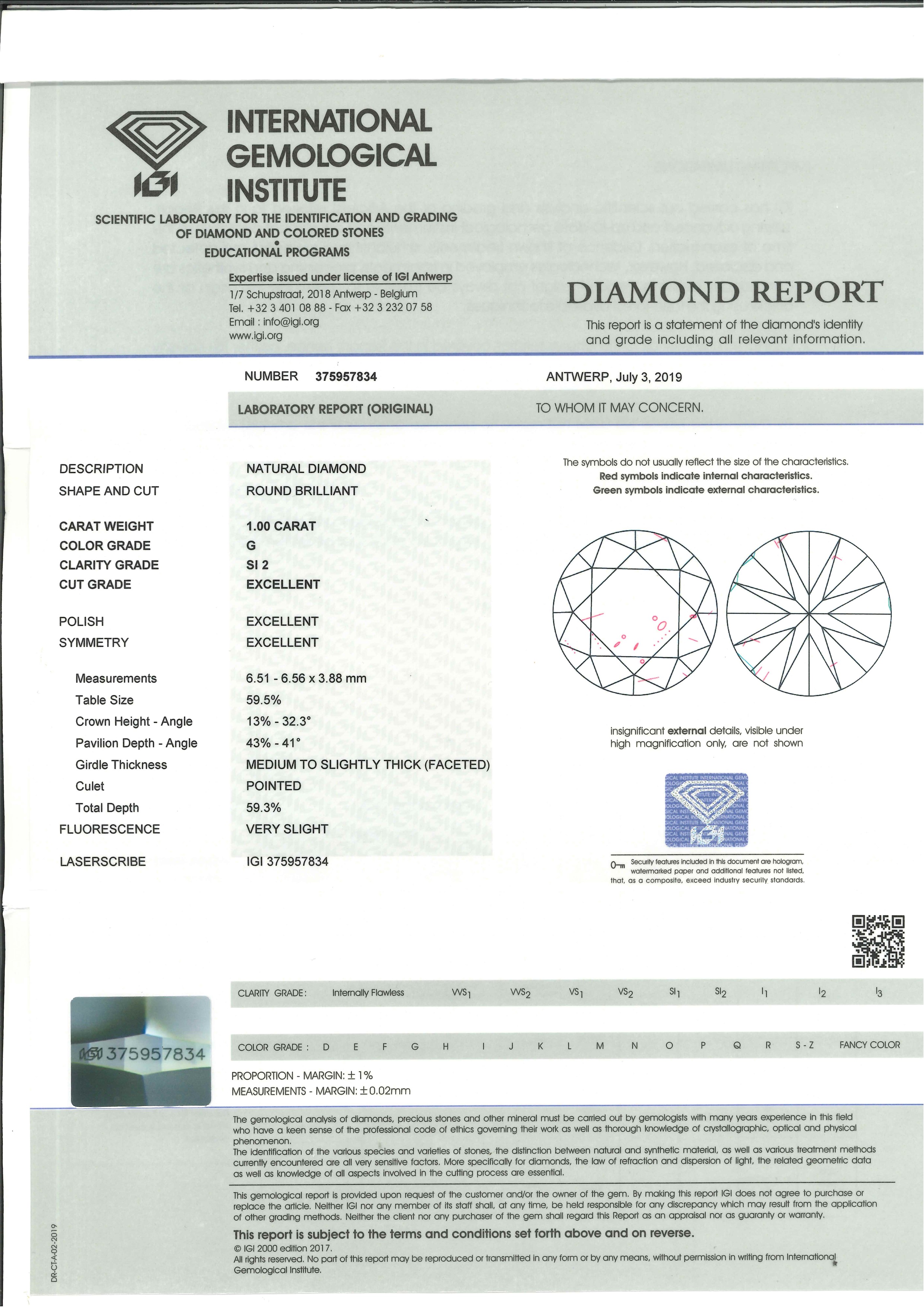Il diamante è accompagnato da certificato gemmologico n. 375957834 del 03/07/2019 IGI, Antwerp e da certificato gemmologico n. 245651302 del 13/02/2017 IGI, Antwerp.