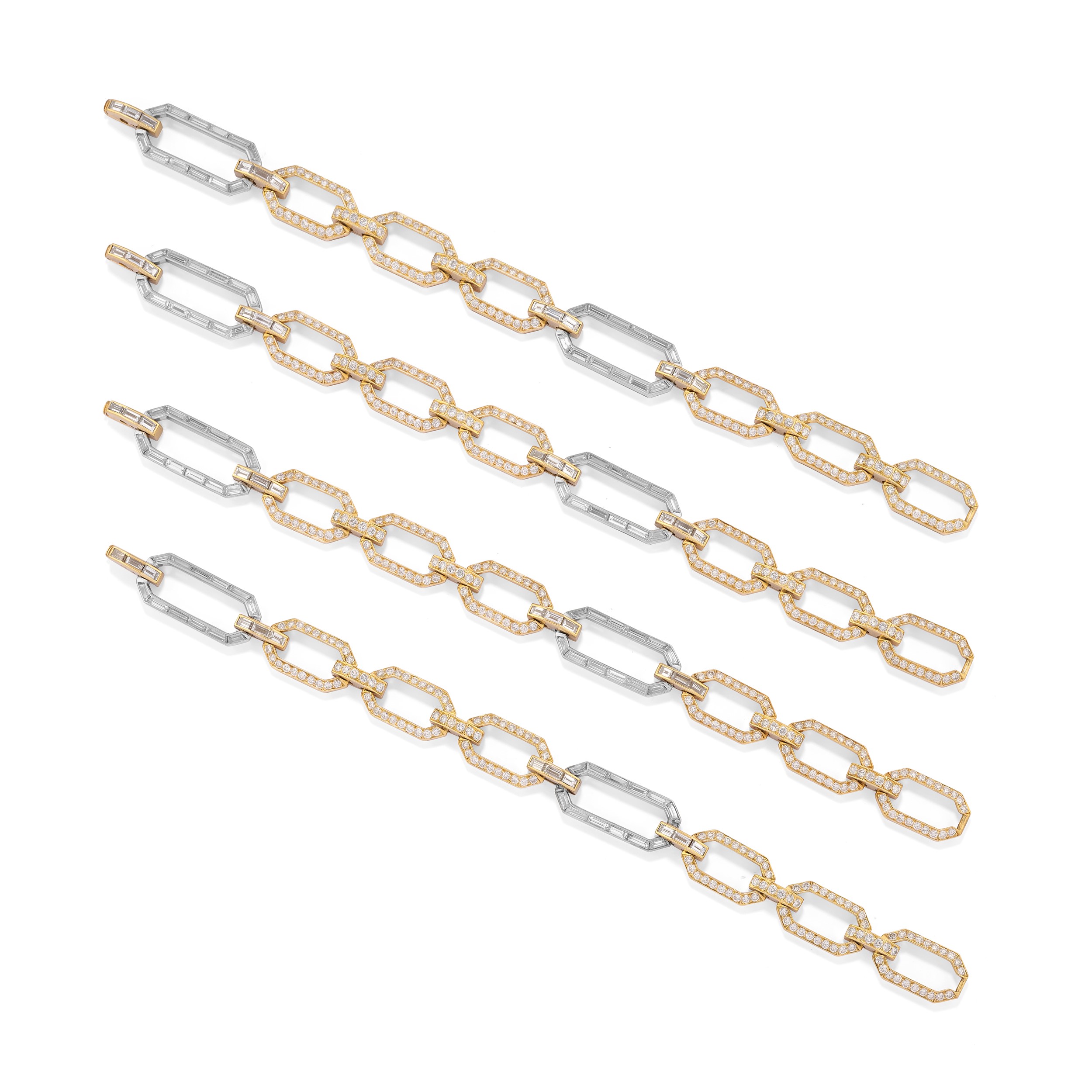 in oro giallo 18k e platinoa catena con maglie ottagonali interamente decorate da diamanti taglio baguette e brillante per totale ct 14,00 circa, scomponibile in quattro bracciali (cm 19,00 cad.) o in collana girocollo e due bracciali.