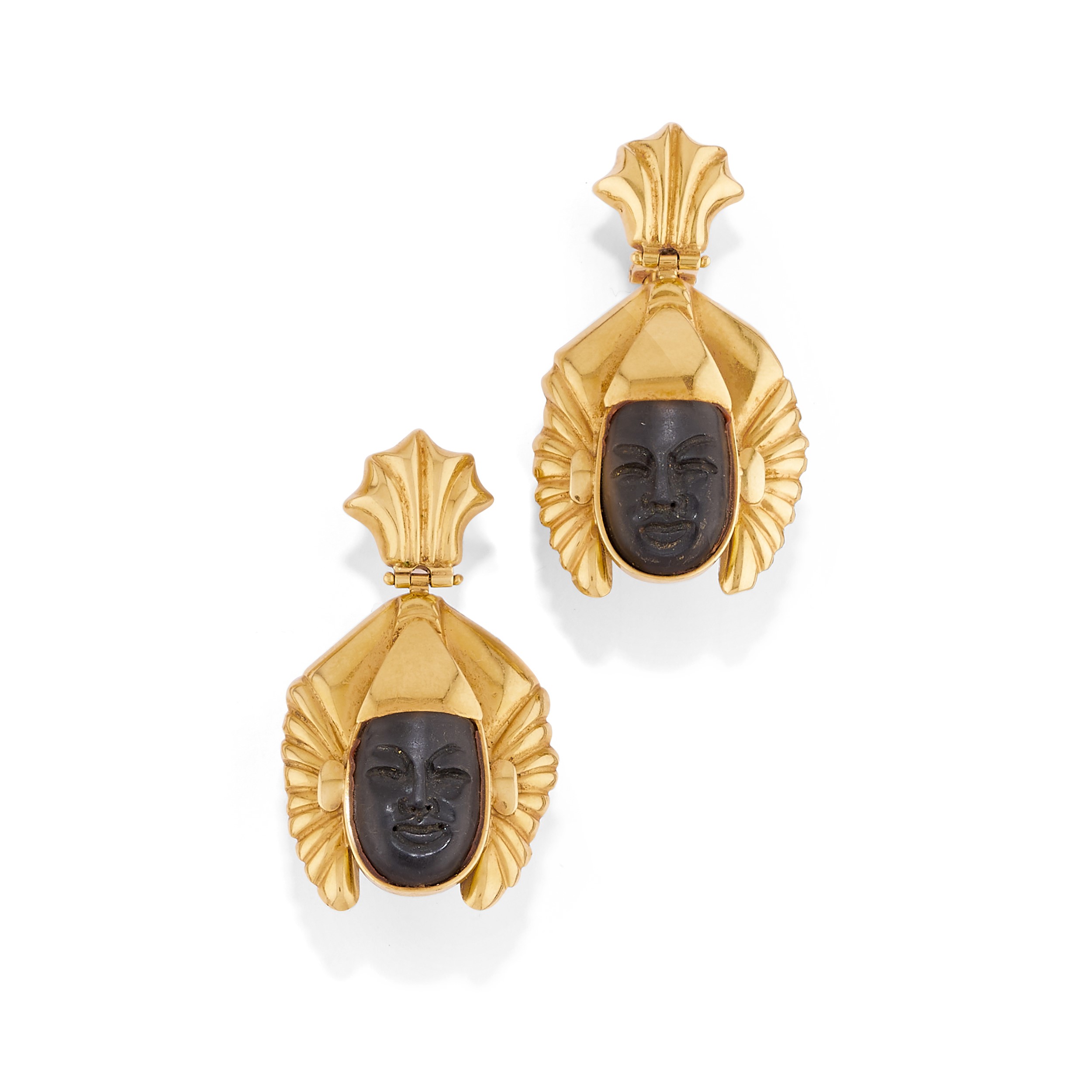 in oro giallo 18kcon inserti in legno incisi a volto, composta da collana e coppia di orecchini con chiusura perno e clip.