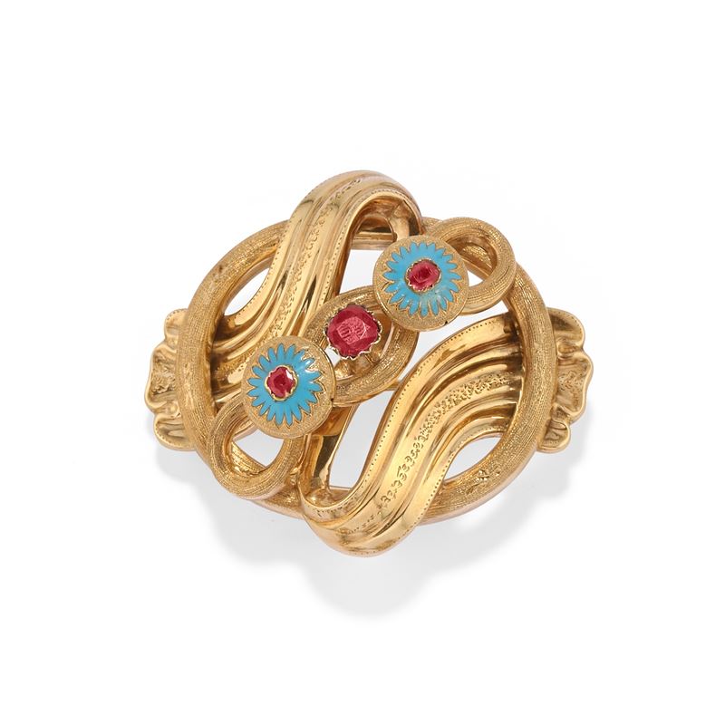 in oro giallo 14kcomposta da spilla e orecchini con chiusura a monachella, decorati da smalto e pietre rosse.