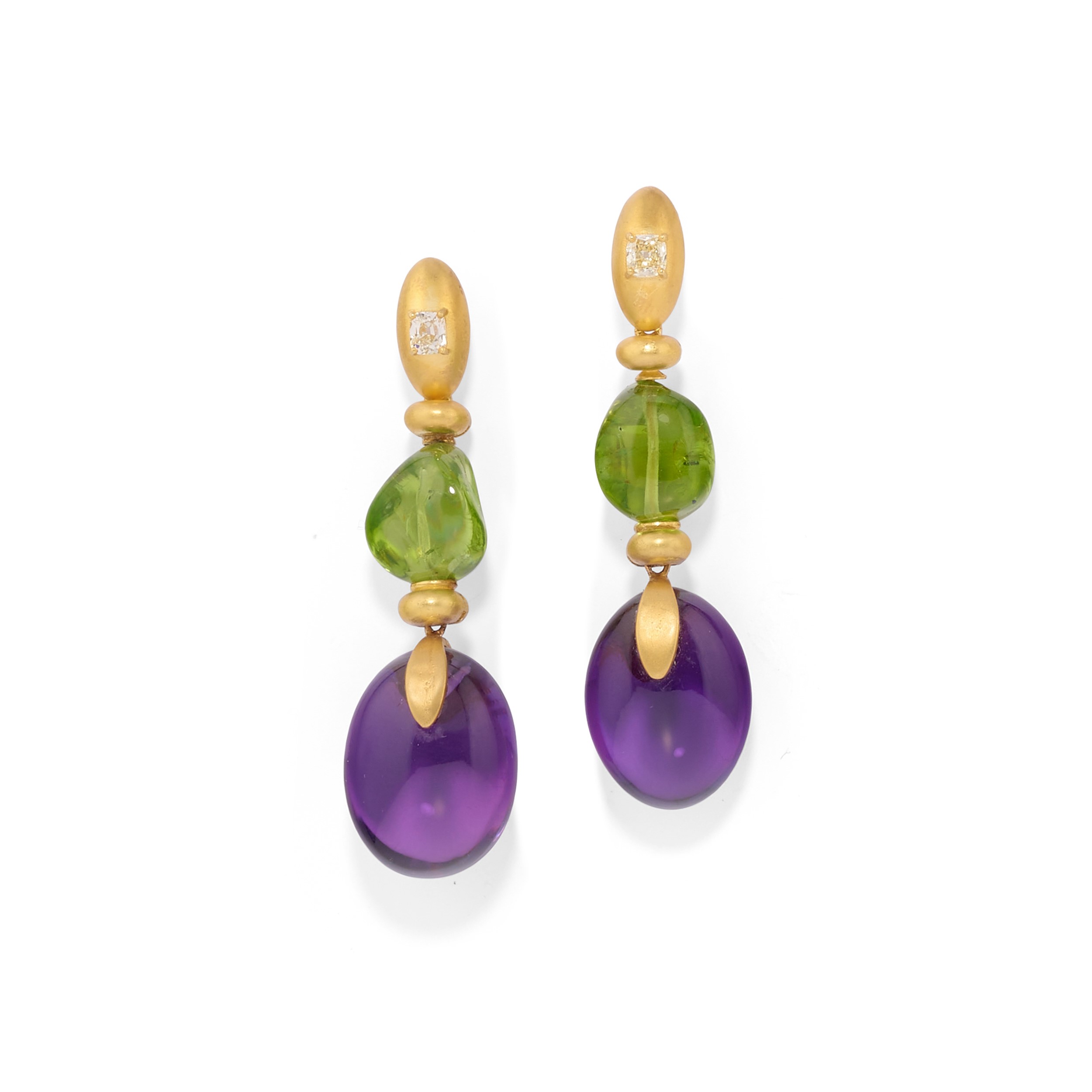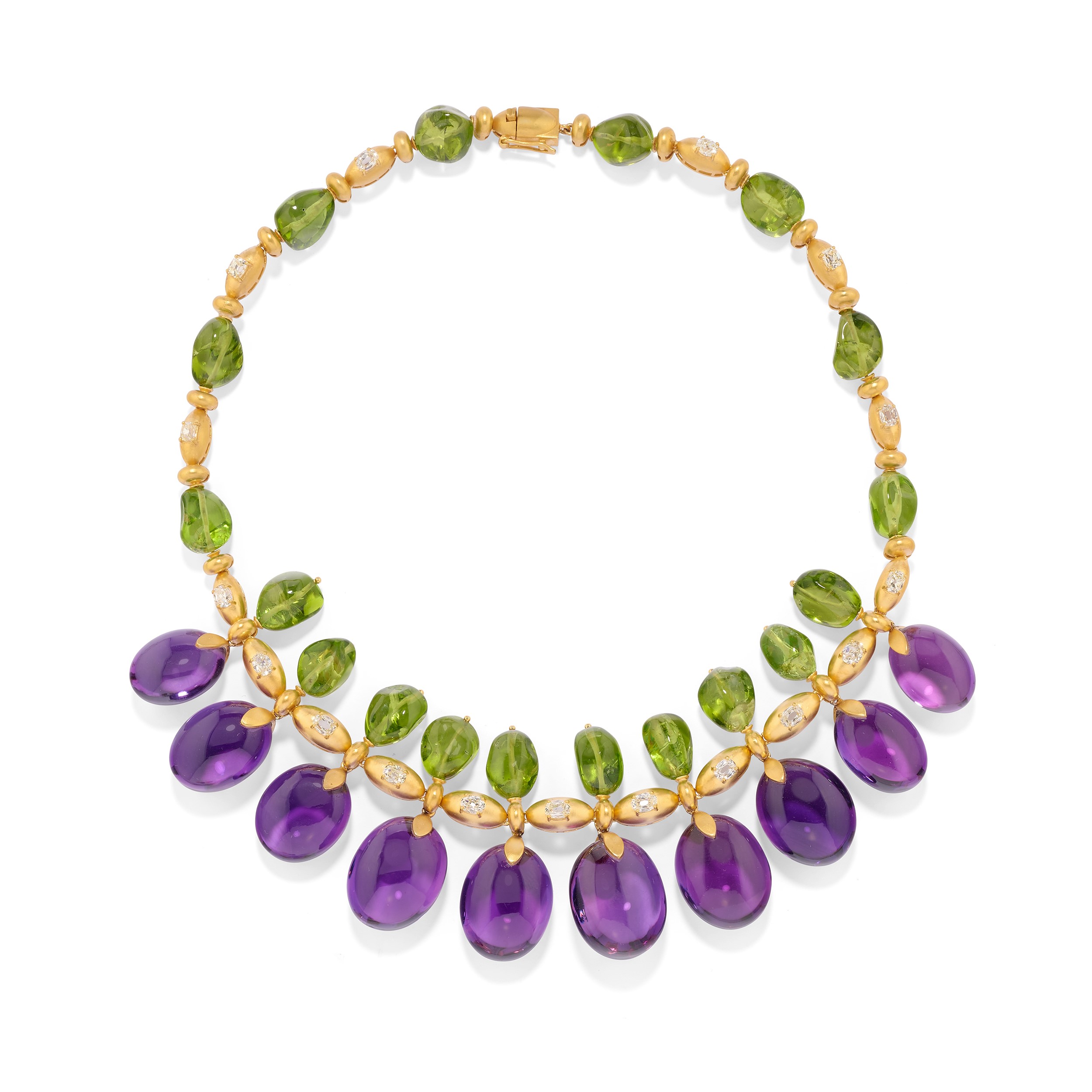 in oro giallo 18kcomposta da collana girocollo e orecchini pendenti con chiusura perno e farfalla, decorata con ametiste ovali cabochon, pepite in peridoto e diamanti di forma ovale taglio vecchio per totale ct 5,00 circa.