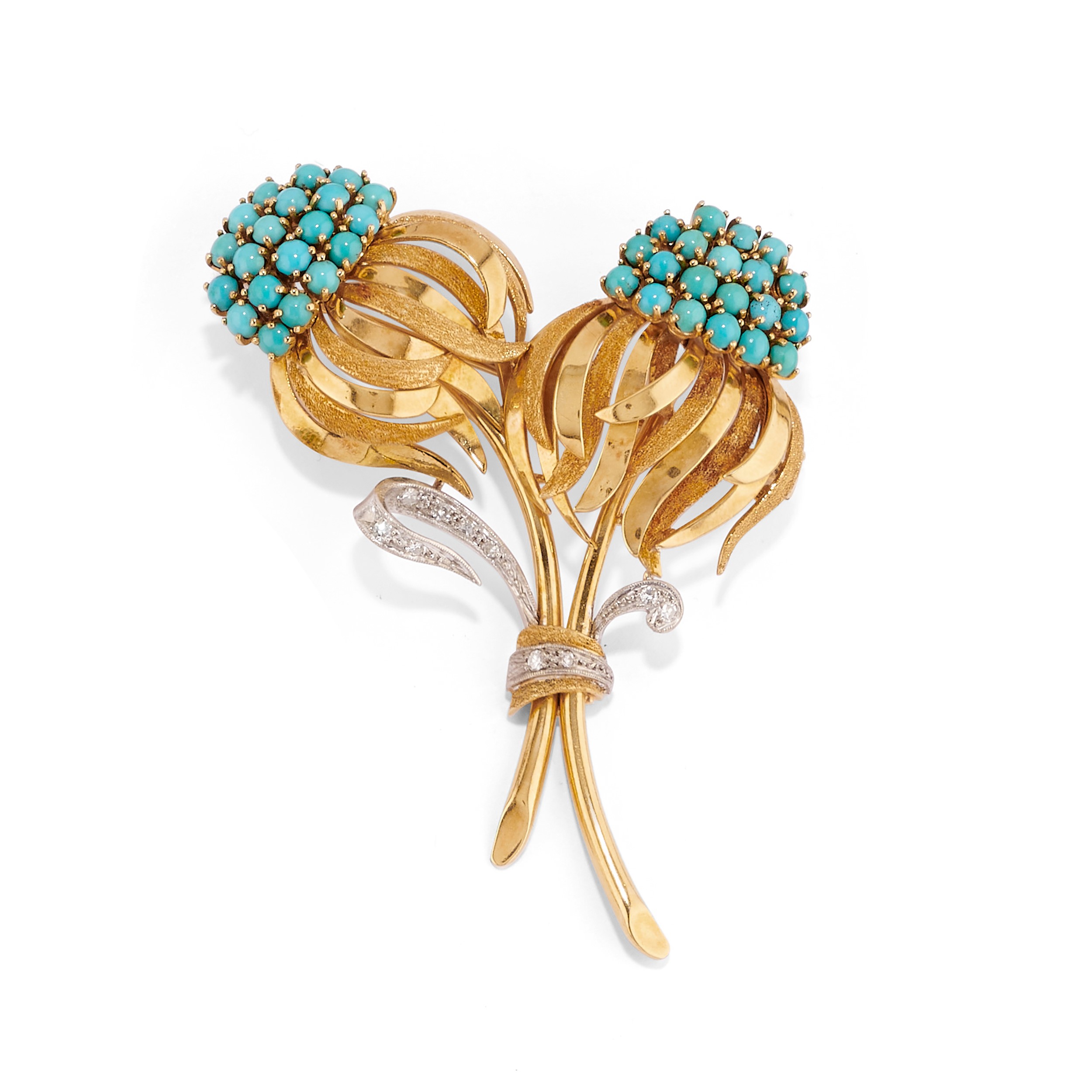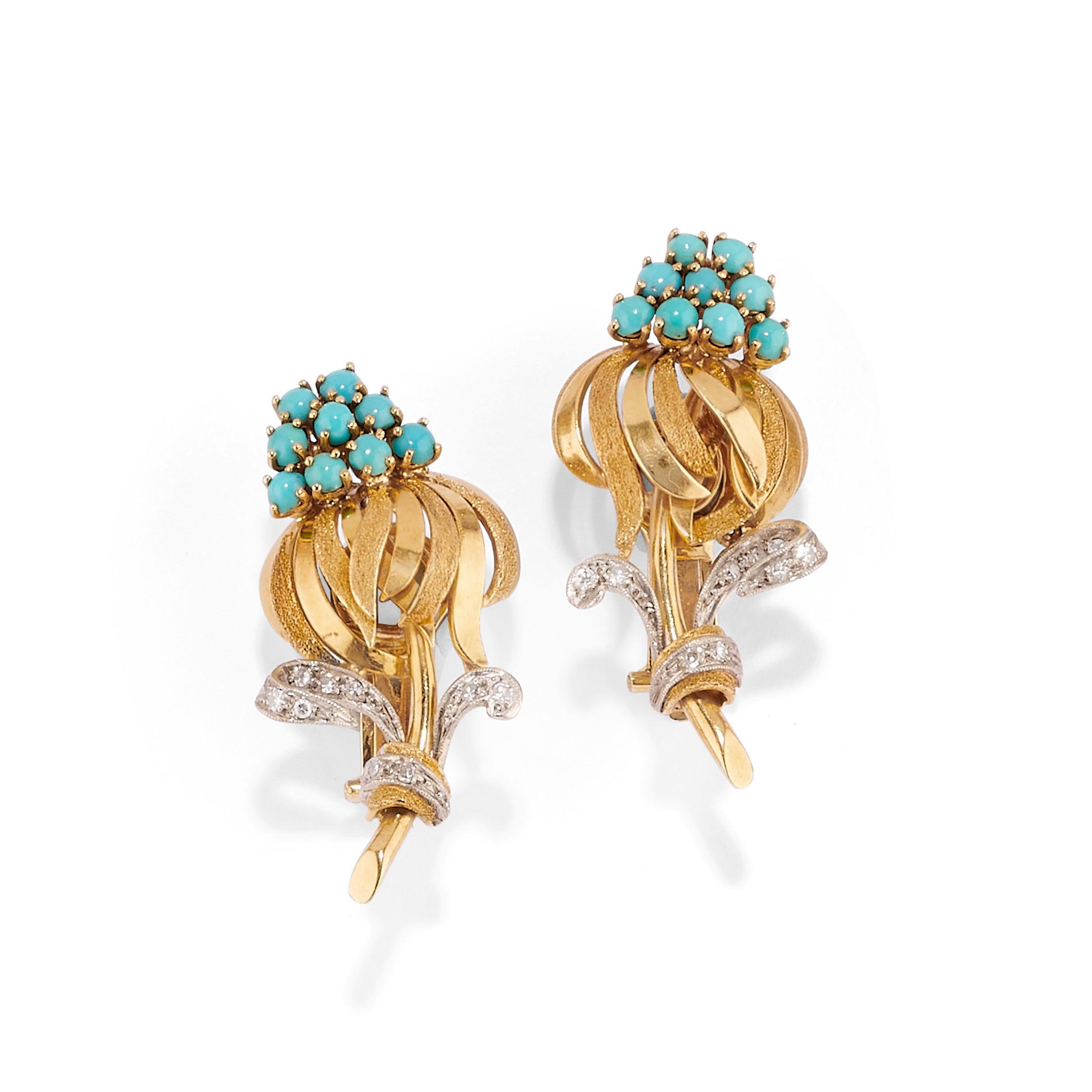 in oro bicolore 18kcomposta da spilla e coppia di orecchini con chiusura a clip, oro satinato e liscio con turchesi taglio rotondo cabochon e diamanti taglio huit-huit.