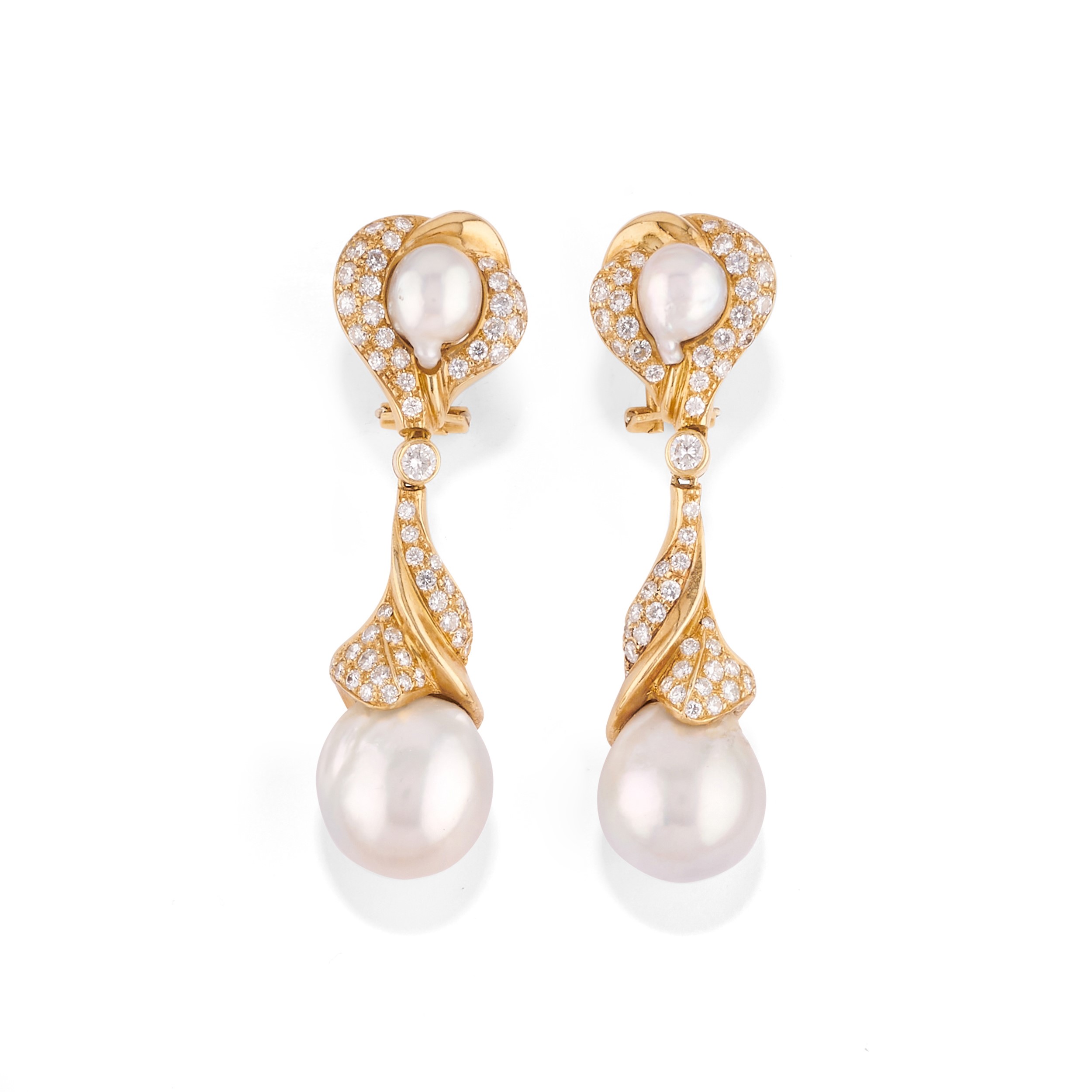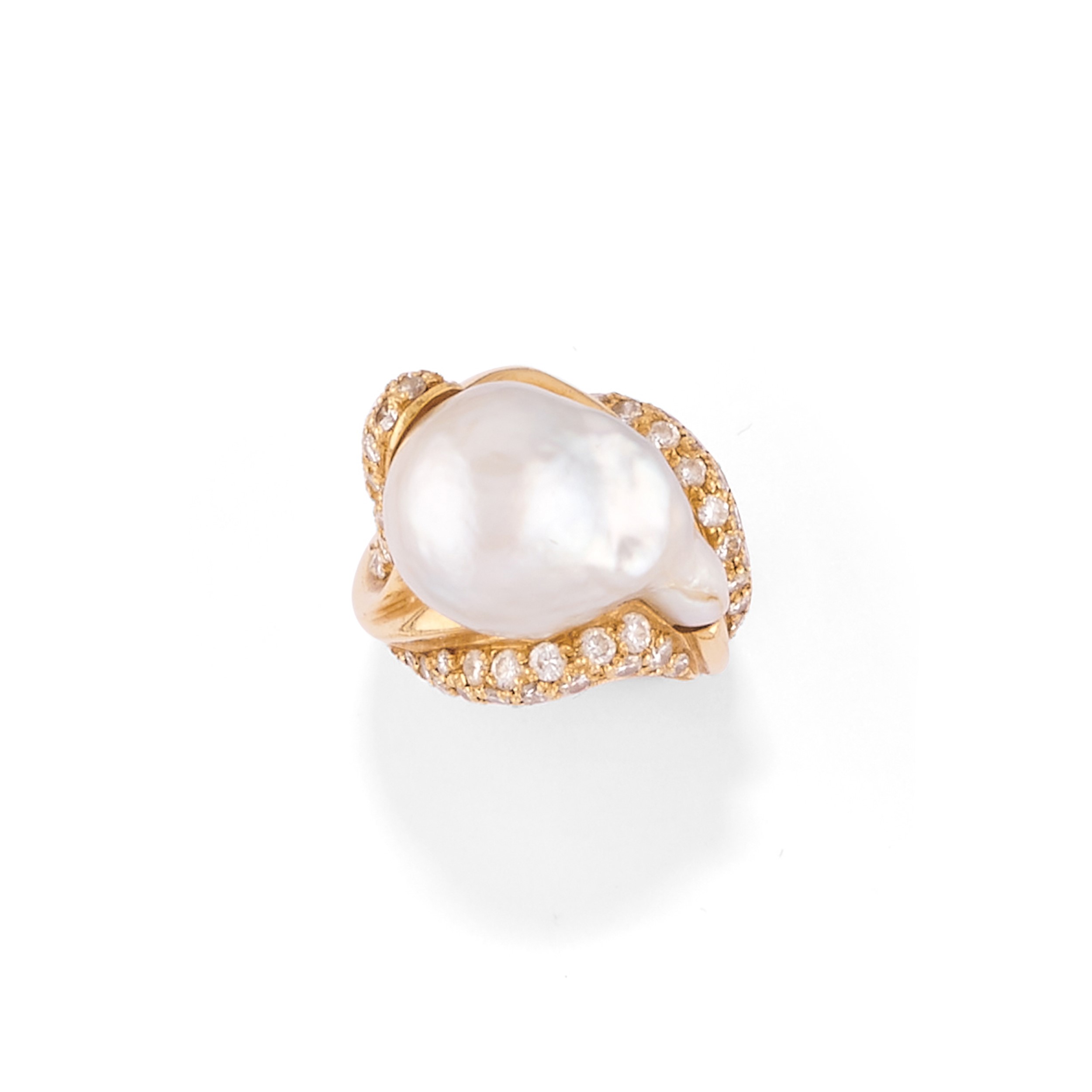 in oro giallo 18kcomposta da anello e coppia di orecchini con chiusura perno e clip, impreziositi da perle coltivate barocche e diamanti taglio brillante per totale ct 3,00 circa.
