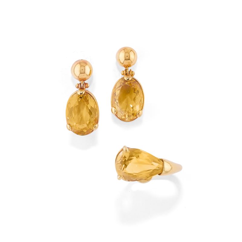 composta da anello con quarzo taglio goccia e coppia di orecchini con quarzi taglio ovale, con chiusura perno e farfalla.