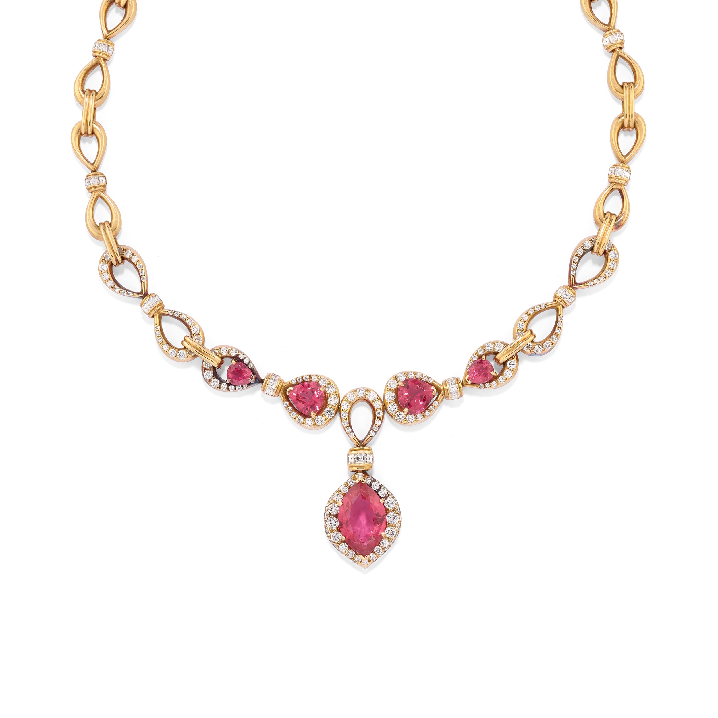 in oro giallo 18kcomposta da collana a girocollo con motivo centrale pendente decorato da tormaline rosa taglio marquise e goccia e orecchini pendenti, a doppio corpo con tormaline rosa taglio goccia e diamanti taglio brillante e carrè per totale ct 6,50 circa, chiusura perno e clip.