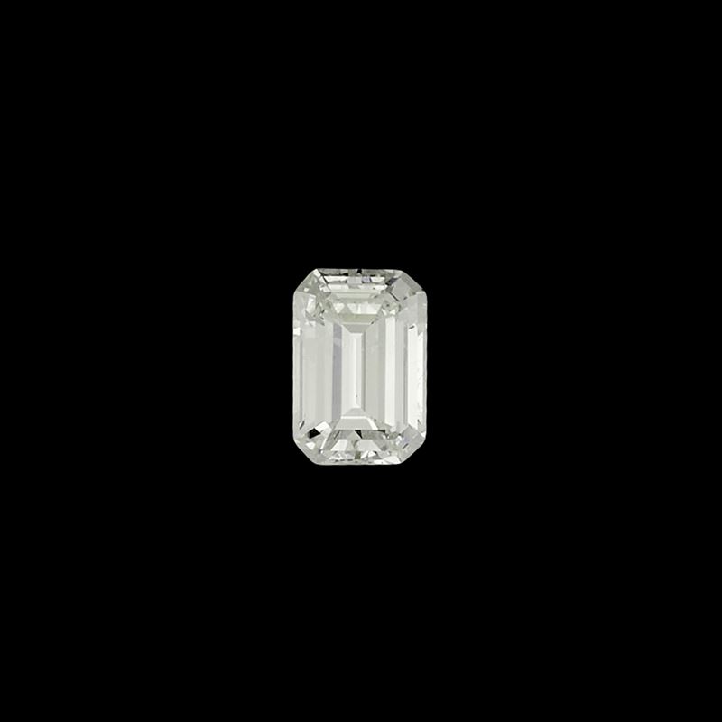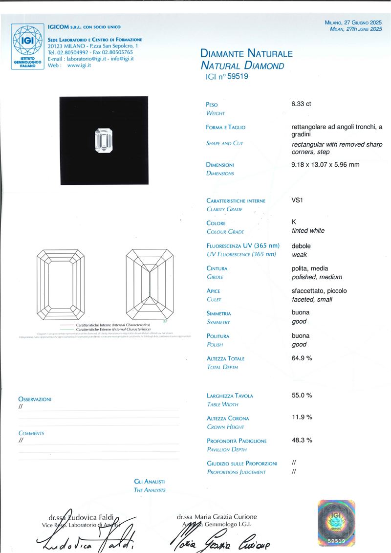 diamante di forma rettangolare ad angoli tronchi, taglio a gradini di ct 6,33, colore K, purezza VS1.Base d'asta