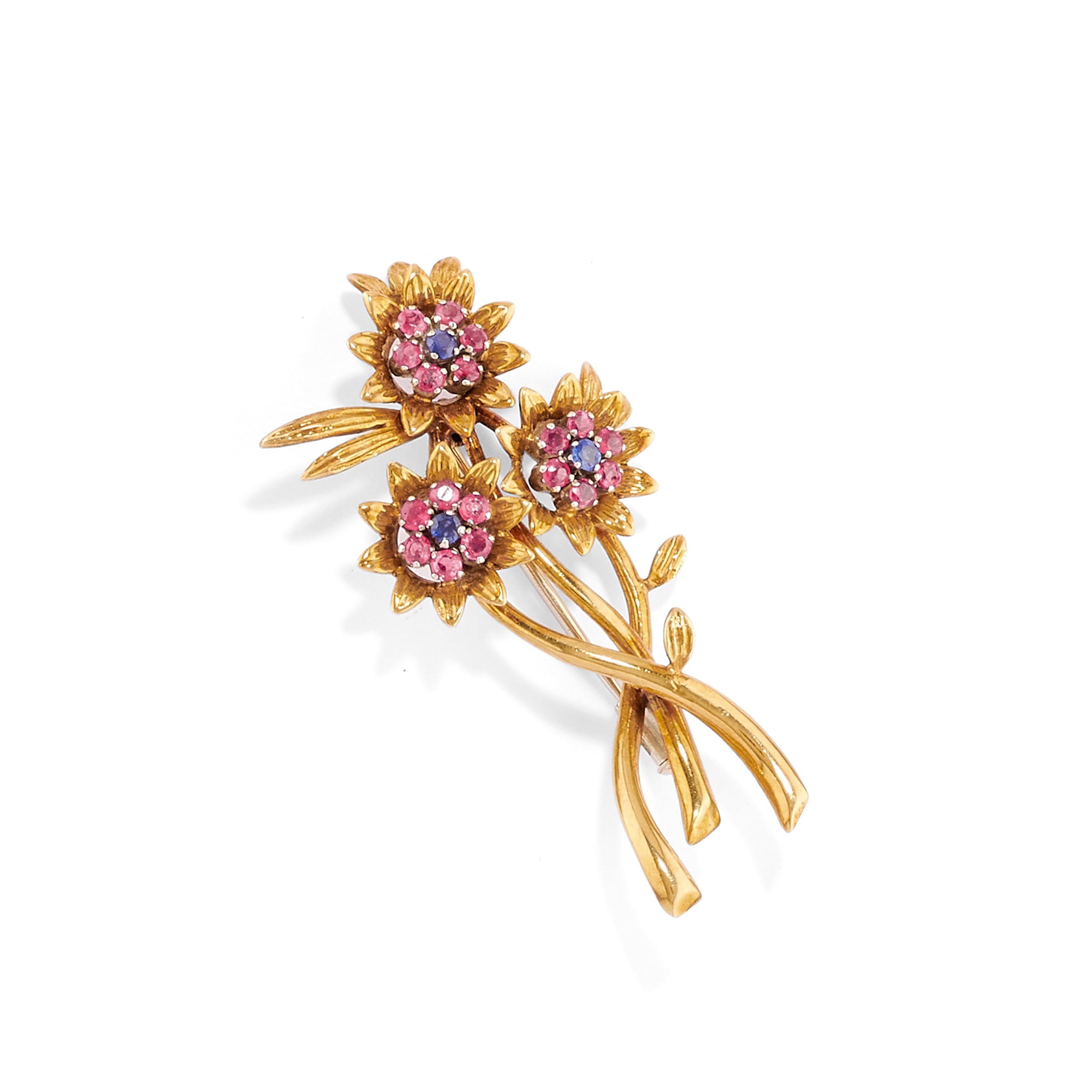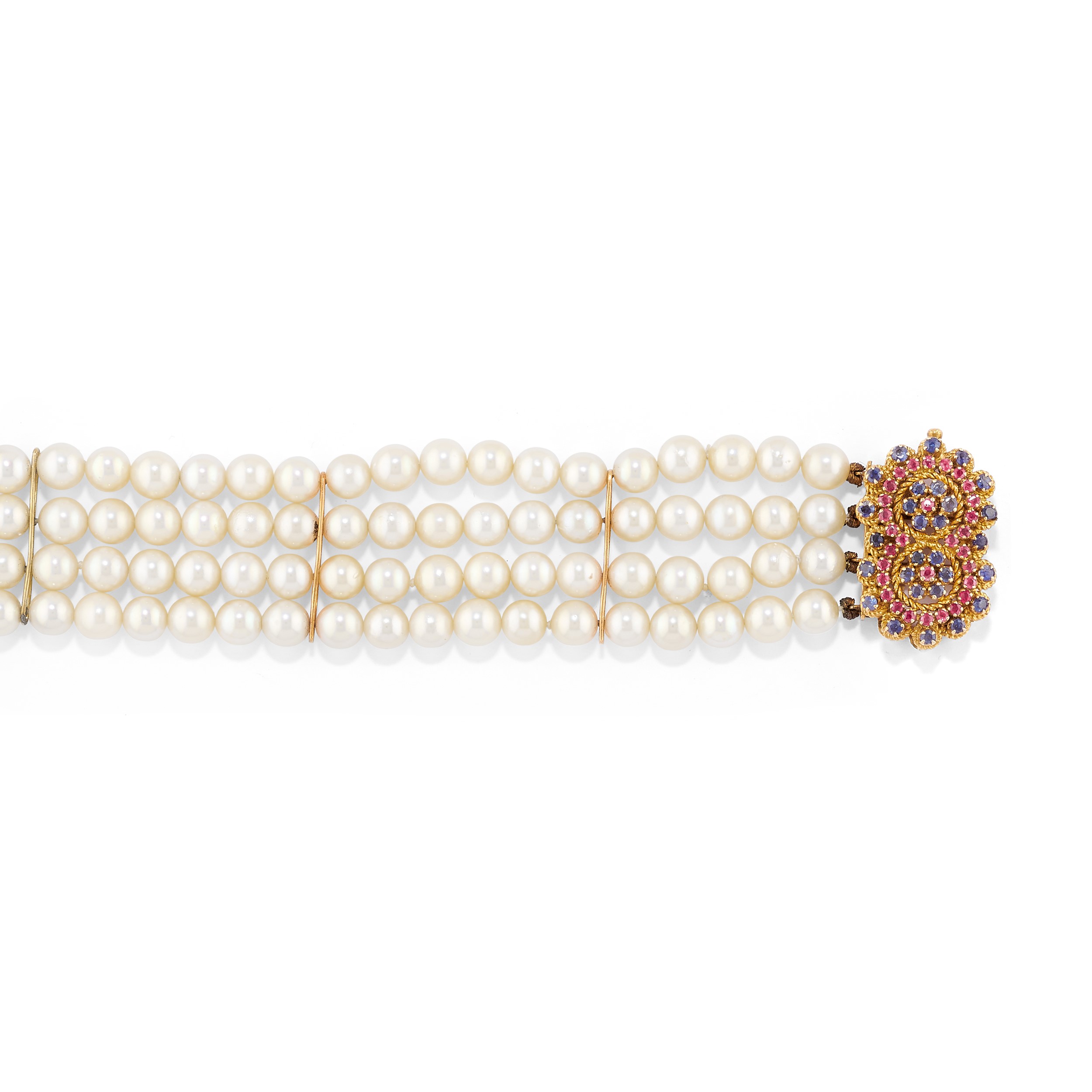 in oro giallo 18kcomposto da bracciale a quattro fili di perle coltivate di mm 6,00/6,50 circa, chiusura con zaffiri e rubini taglio rotondo e spilla con fiori decorati da rubini e zaffiri taglio rotondo.