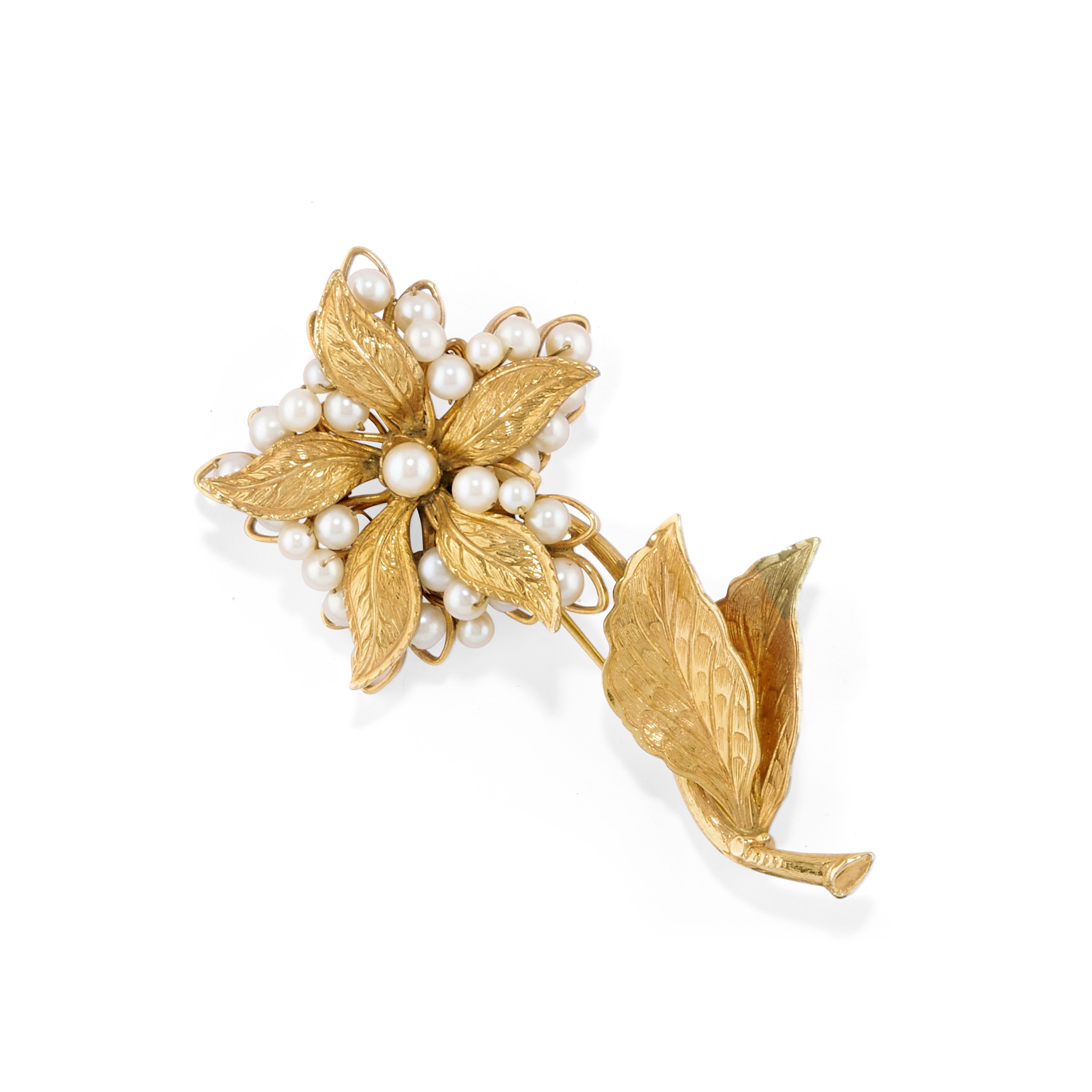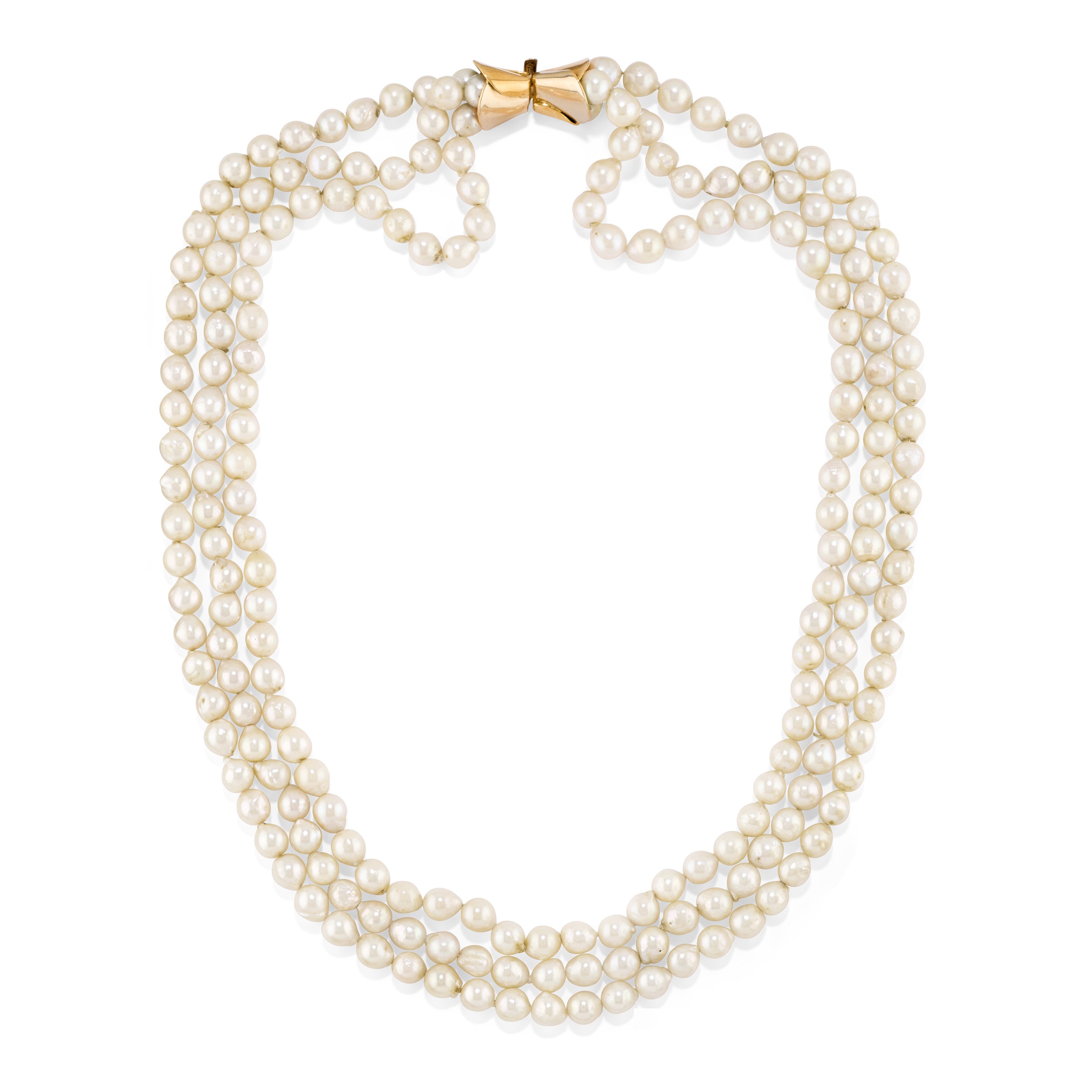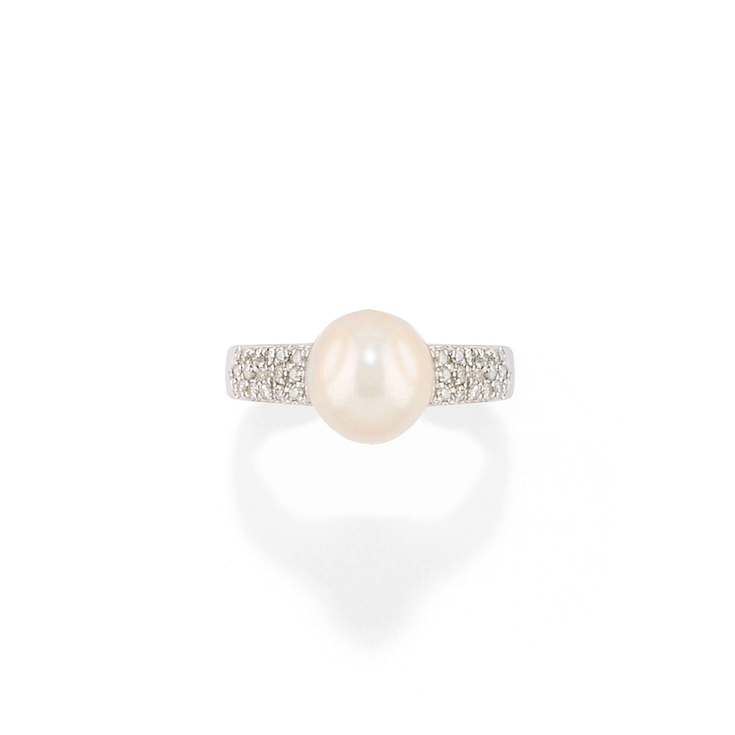 in oro bicolore 12k e 18kcomposto da collana a tre fili di perle coltivate di mm 7,00/7,50 circa, spilla a forma di fiore con perle coltivate e anello con perla coltivata di mm 10,00 circa, ai lati diamanti taglio brillante.