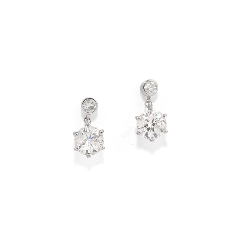pendenti, con diamanti taglio brillante per totale ct 2,40 circa (prob. colore I purezza P), chiusura perno e farfalla in silicone.