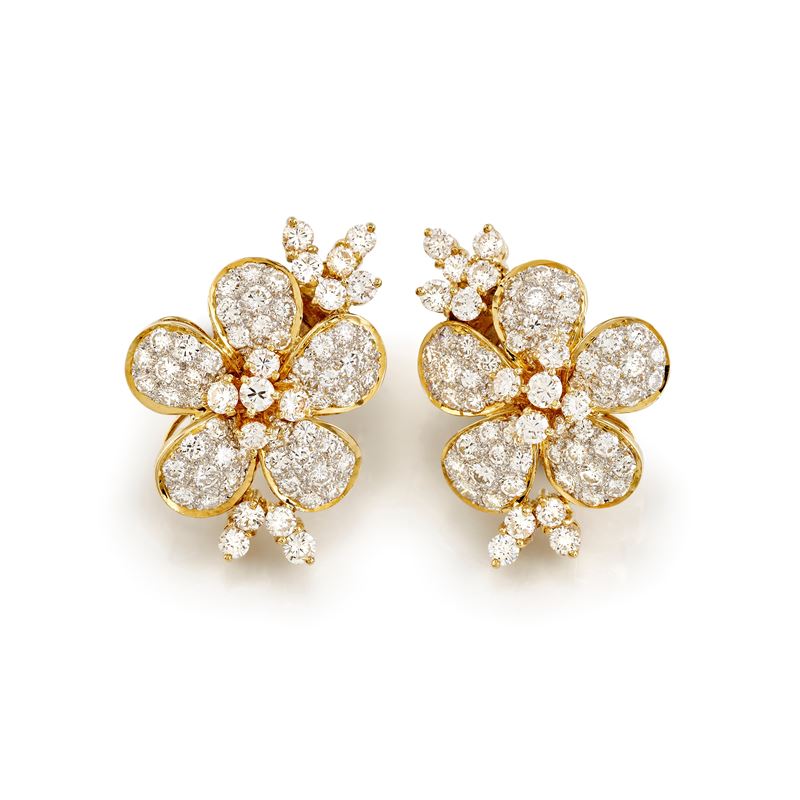 in oro giallo 18kmotivo a fiore, interamente decorati da diamanti taglio brillante per totale ct 4,00 circa, chiusura perno e farfalla con silicone.