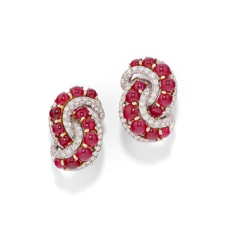 disegno a nodo, decorato da rubini taglio rotondo cabochon e diamanti taglio brillante per totale ct 12,00 circa, chiusura perno e clip.