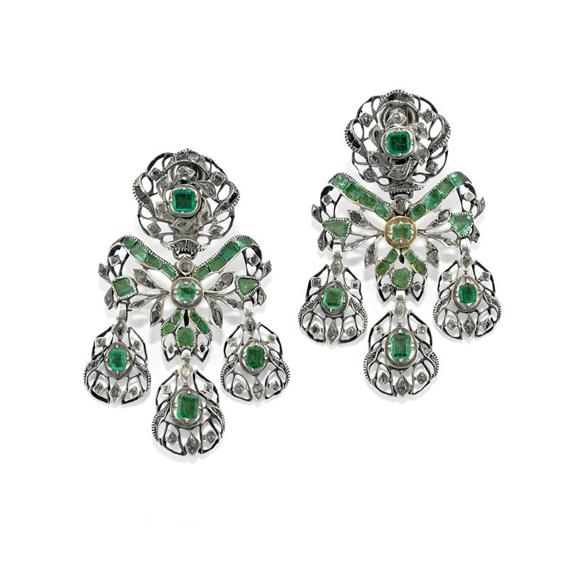 in argentoa chandelier, con pendenti estraibili, disegno a fiocco, decorati da smeraldi di forme diverse e diamanti taglio rosa, chiusura a clip.