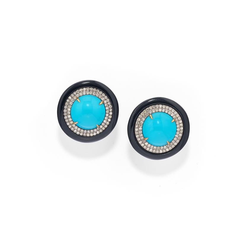 in oro 14k e argentoa bottone, con turchese taglio rotondo cabochon entro doppio contorno in diamanti taglio brillante per totale ct 0,70 circa e onice, chiusura perno e farfalla.