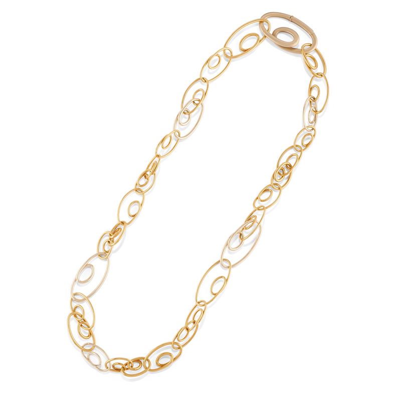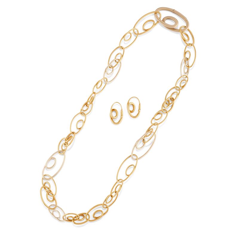 in oro bicolore 18kcomposta da collana e coppia di orecchini ad anelli.