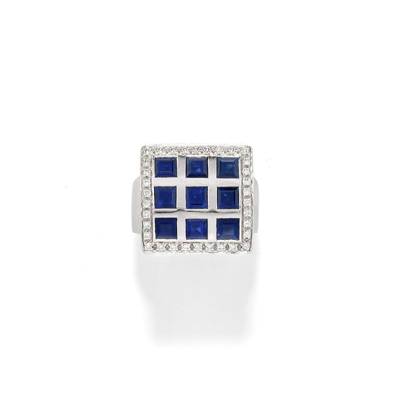 di forma quadrata, griglia con zaffiri taglio carrè per totale ct 3,30 circa e contorno in diamanti taglio brillante per totale ct 0,60 circa.
