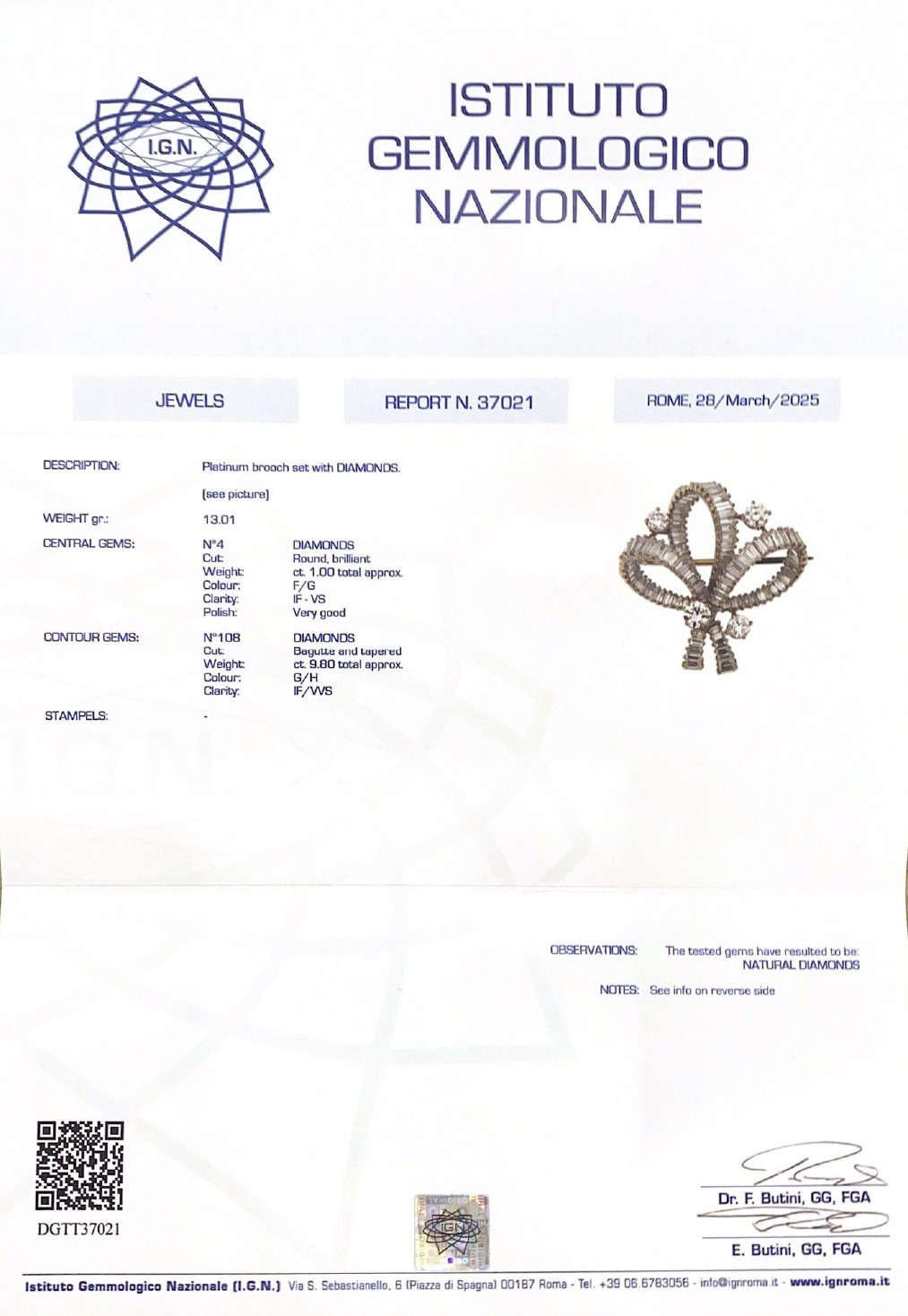 in platinoimpreziosita da diamanti taglio brillante per totale ct 1,00 circa, colore F/G, purezza IF/VS, diamanti taglio baguette e tapered per totale ct 9,80 circa, colore G/H, purezza IF/VVS.