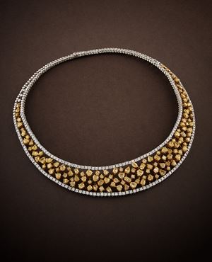 in oro bicolore 18kgirocollo a griffes snodato, con diamanti fancy yellow di forma rotonda, ovale, triangolare, goccia, cuore, triangolo, taglio sfaccettato per totale ct 20,00 circa entro contorno di diamanti taglio brillante per totale ct 6,00 circa.